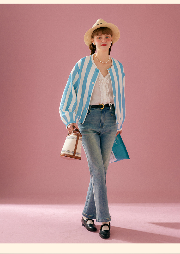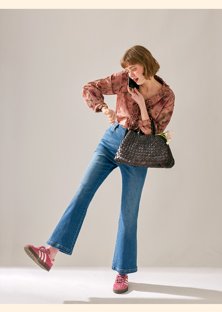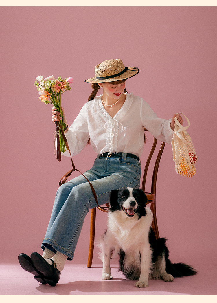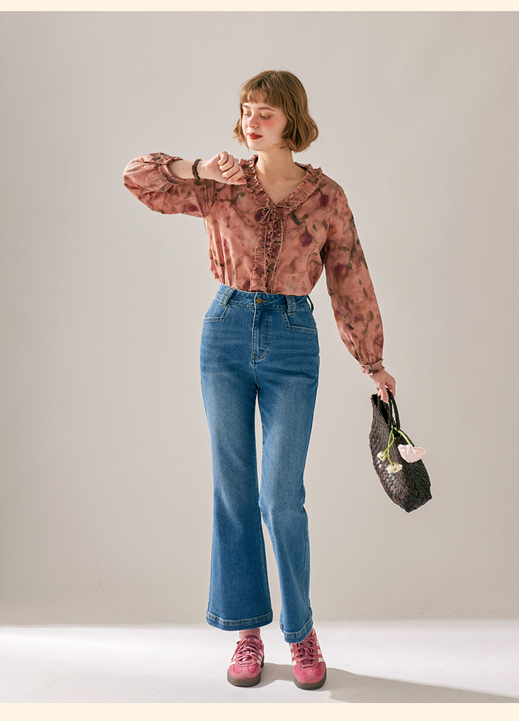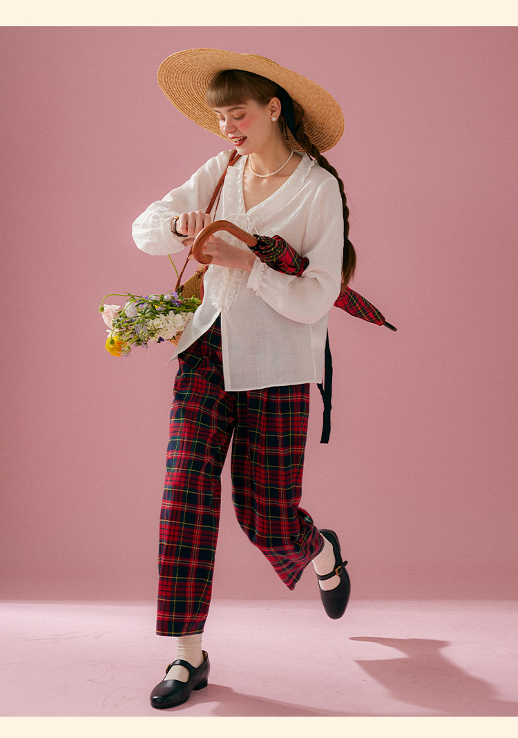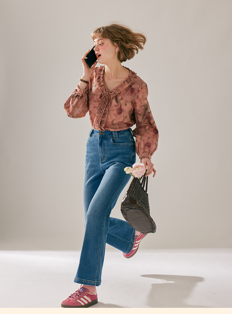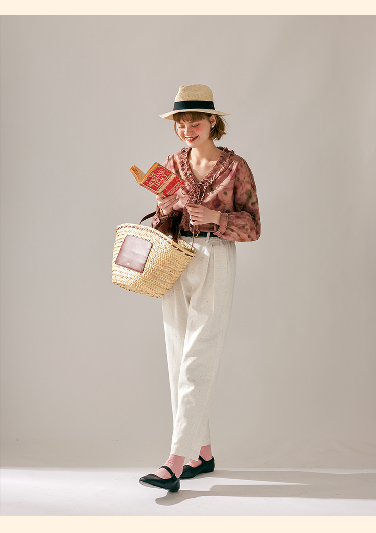 浮生八记/24A008/复古全亚麻全棉玫瑰花边V领系带小衫