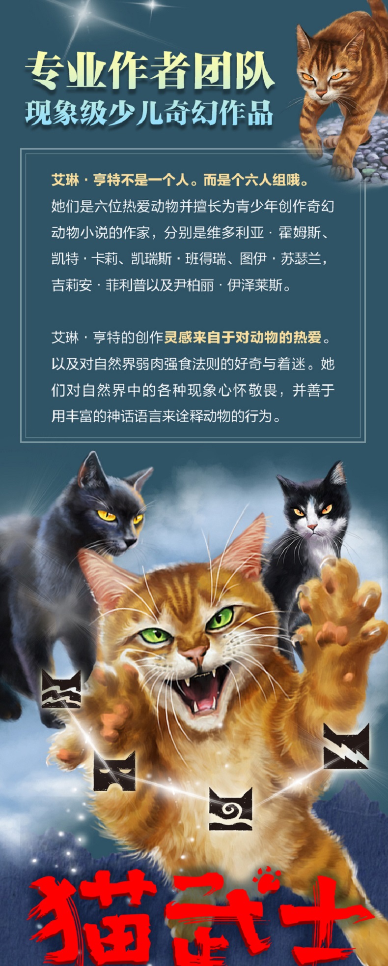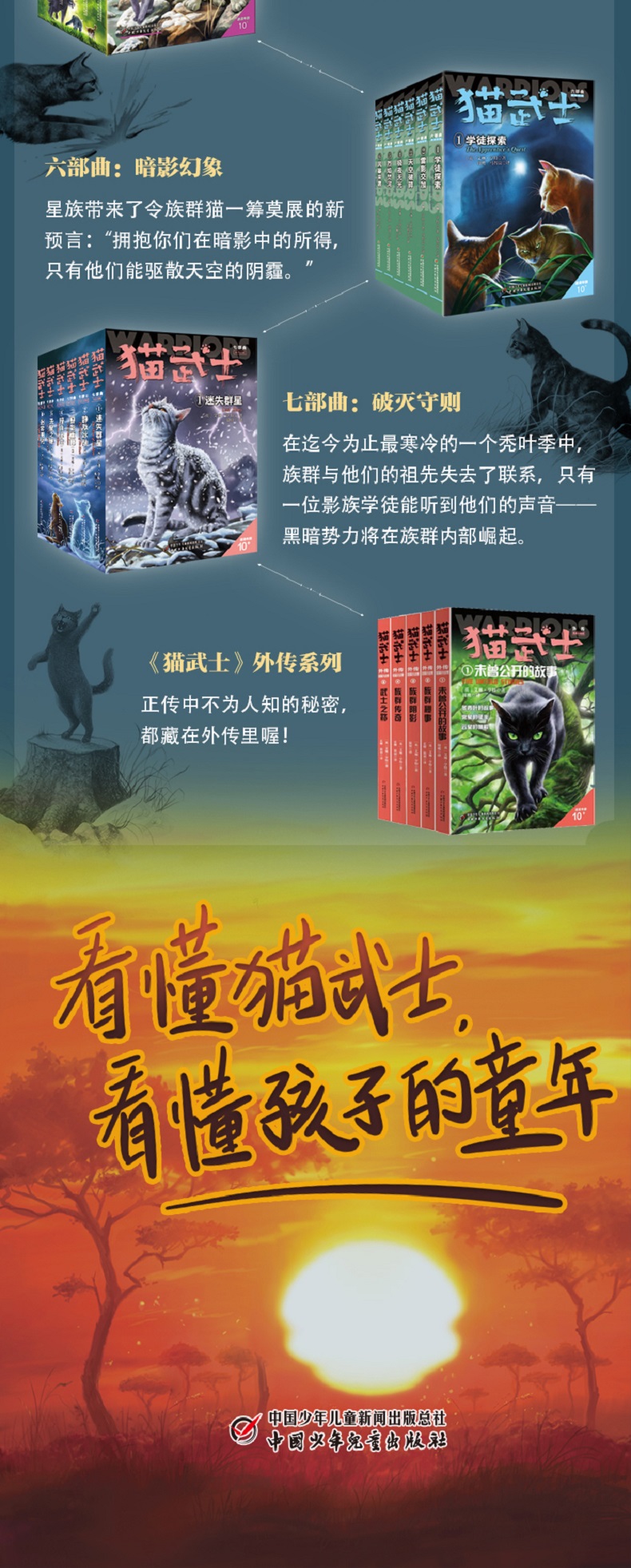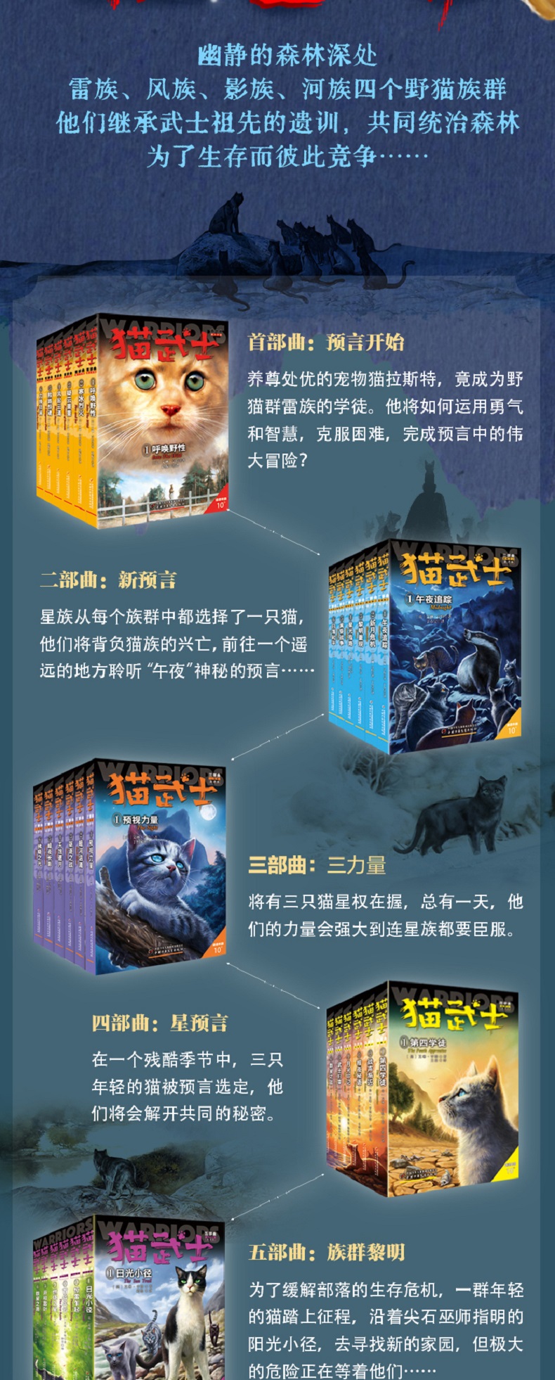 《河翻浪涌》 新纪元的黎明曙光已经降临, 但危险仍潜藏在族群之中。 和平、团结与变革的时代来临,新生代的武士们登上了舞台。来自五大族群的族长们一致同意,必须改良武士守则,才能维持现有的和睦。但突如其来的悲剧和旧日的恐惧再一次使族群剑拔弩张。只有一位年轻的巫医学徒,才有可能平息将至的风暴…… 《天穹将倾》 迟迟接收不到星族指引, 绝望时刻只能隐瞒真相! 接连失去了几位族长及候选者,河族的重担落到了学徒霜爪的身上,而母亲的遗言“不要相信任何猫”,成了萦绕她心头的不解之谜。面对强势的虎星和其他族群的质疑,左支右绌的河族决定对其他族群撒谎来保护本族的安全。然而,族群巨变,暗流涌动,凛冬已至,天穹将倾! 《影瘴迷心》 族群与武士守则, 都走到了关键的十字路口! 修改后的武士守则允许族群猫更换族群,但影族的新成员感受到的却是日与俱增的排斥。尽管影族武士日束相信每只猫都应得到一个机会,但她的亲生母亲......