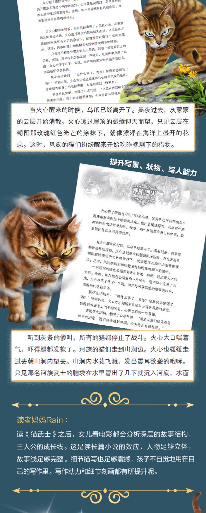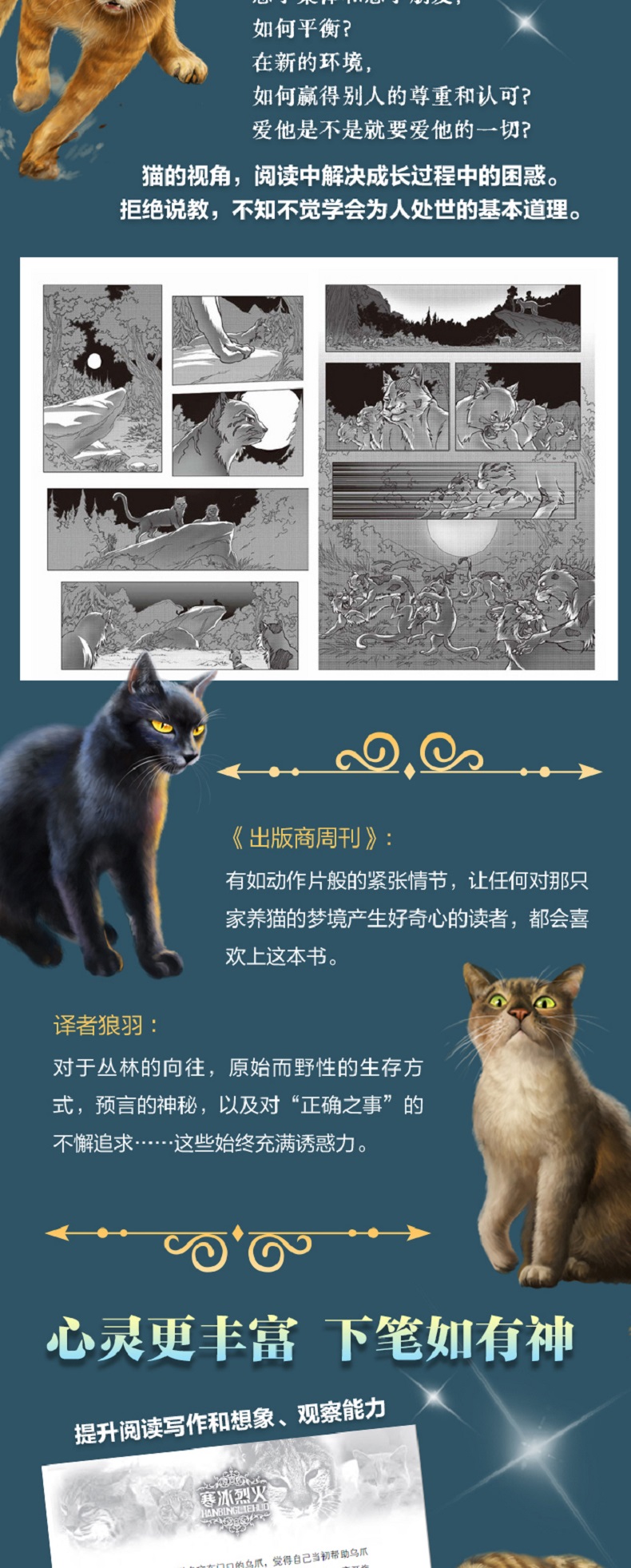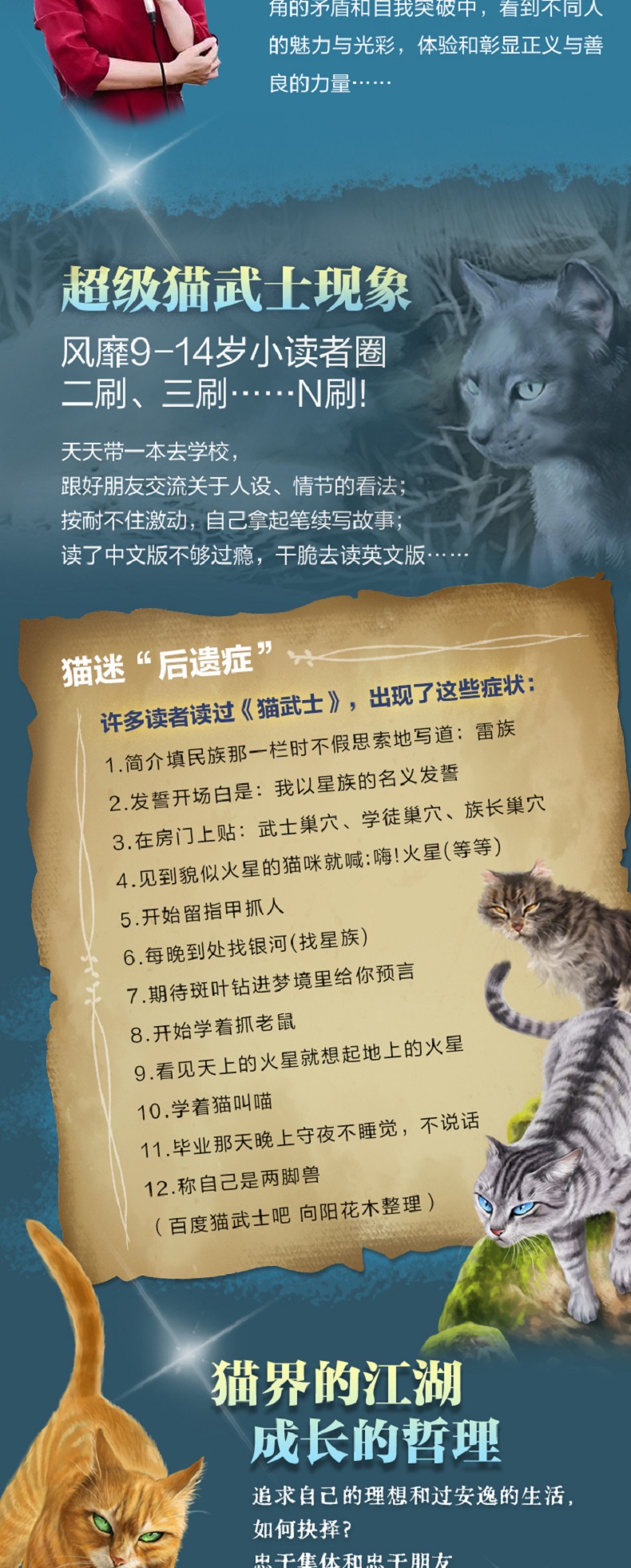 《河翻浪涌》 新纪元的黎明曙光已经降临, 但危险仍潜藏在族群之中。 和平、团结与变革的时代来临,新生代的武士们登上了舞台。来自五大族群的族长们一致同意,必须改良武士守则,才能维持现有的和睦。但突如其来的悲剧和旧日的恐惧再一次使族群剑拔弩张。只有一位年轻的巫医学徒,才有可能平息将至的风暴…… 《天穹将倾》 迟迟接收不到星族指引, 绝望时刻只能隐瞒真相! 接连失去了几位族长及候选者,河族的重担落到了学徒霜爪的身上,而母亲的遗言“不要相信任何猫”,成了萦绕她心头的不解之谜。面对强势的虎星和其他族群的质疑,左支右绌的河族决定对其他族群撒谎来保护本族的安全。然而,族群巨变,暗流涌动,凛冬已至,天穹将倾! 《影瘴迷心》 族群与武士守则, 都走到了关键的十字路口! 修改后的武士守则允许族群猫更换族群,但影族的新成员感受到的却是日与俱增的排斥。尽管影族武士日束相信每只猫都应得到一个机会,但她的亲生母亲......
