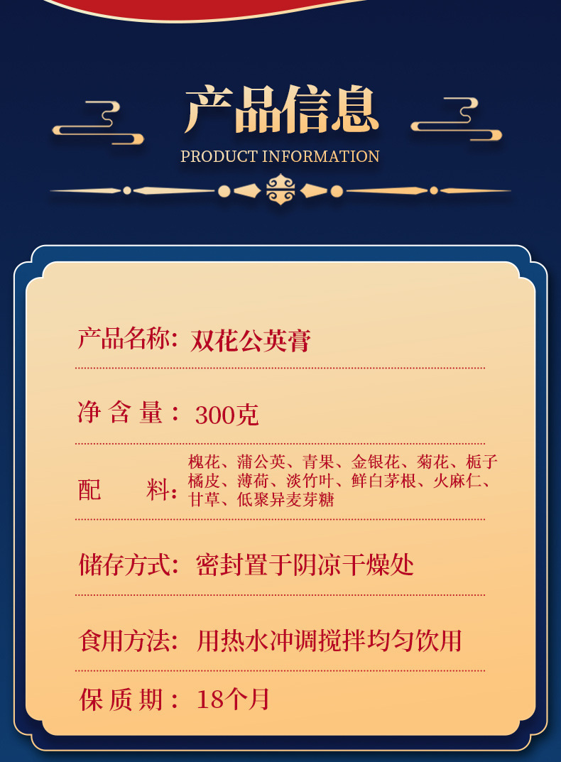 配料成分:槐花、蒲公英、金银花、菊花、橘皮、薄荷、淡竹叶、鲜白茅根、火麻仁、甘草、低聚异麦芽糖