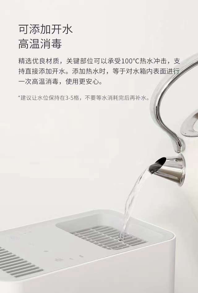 为干燥冬季带来最贴心的呵护。4.5L超大水箱,持续滋润一整晚。支持添加各种水源,还可直接添加开水,关键部位材质可以承受100°C热水冲击,添加热水时,等于把水箱烫了一遍,使用更安心。