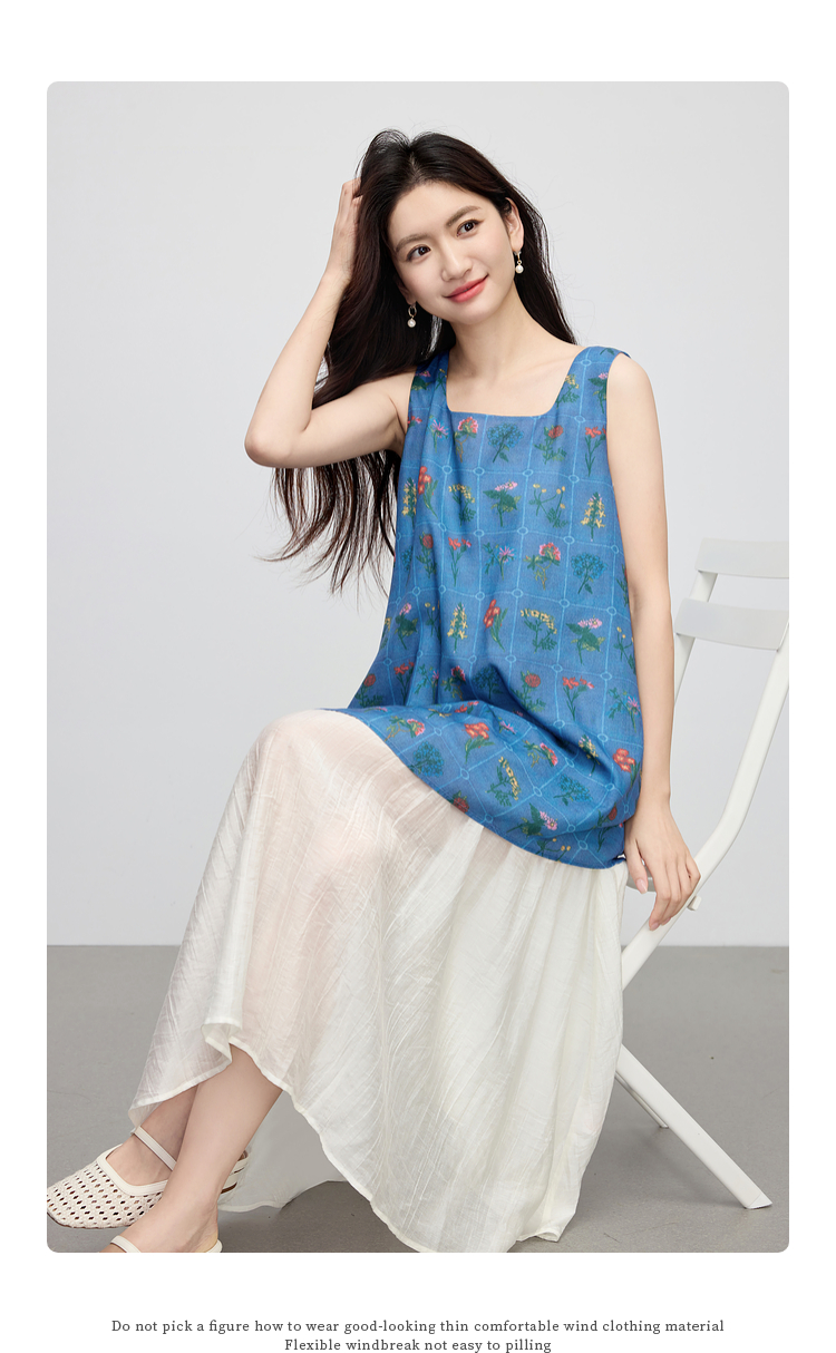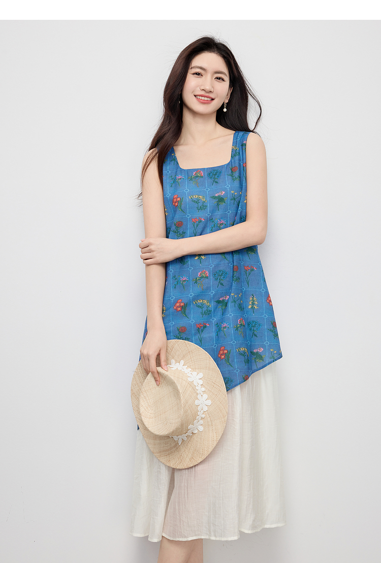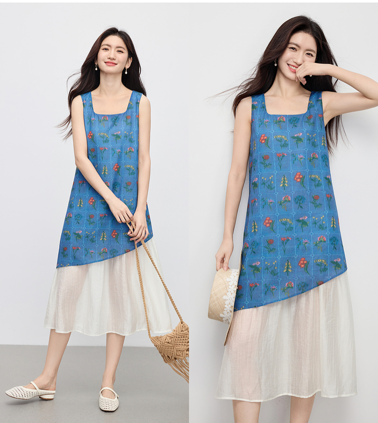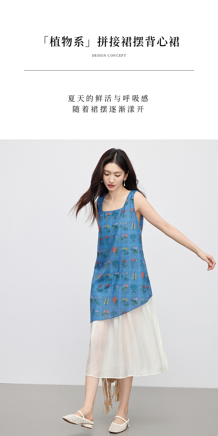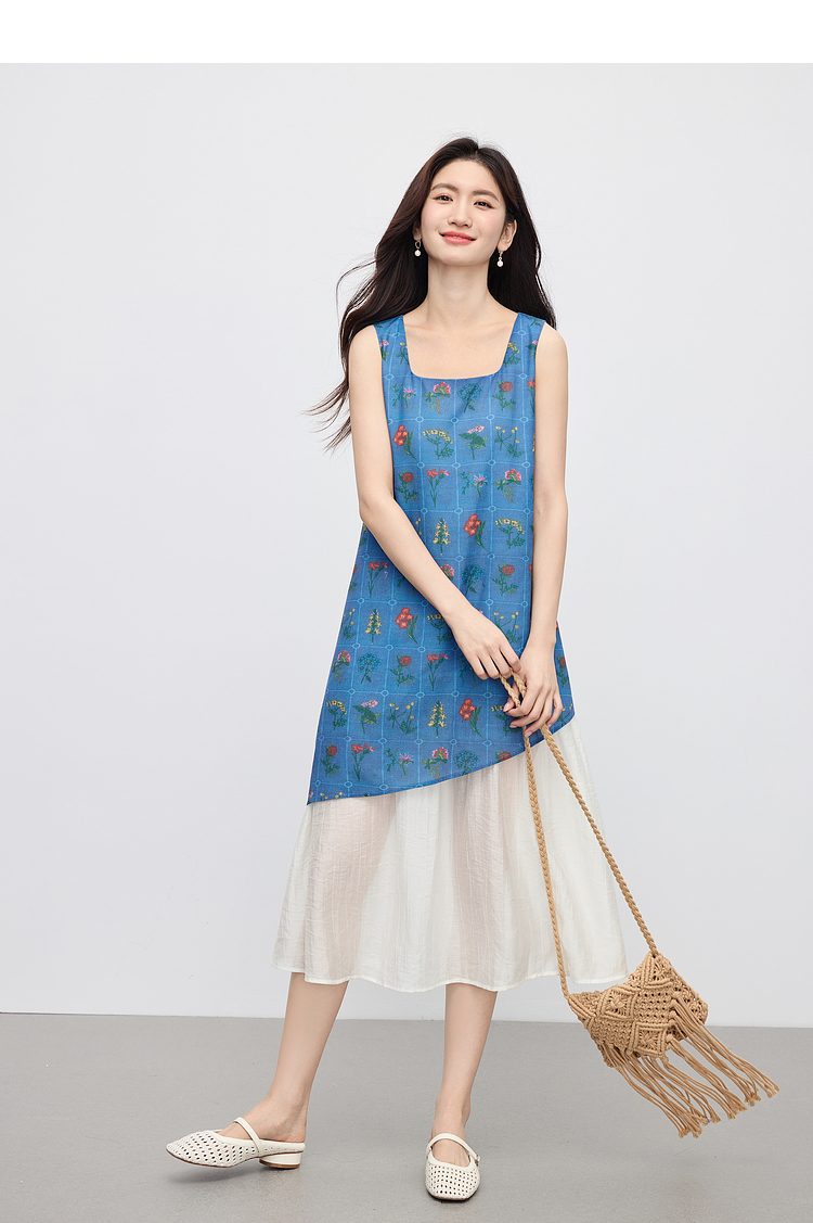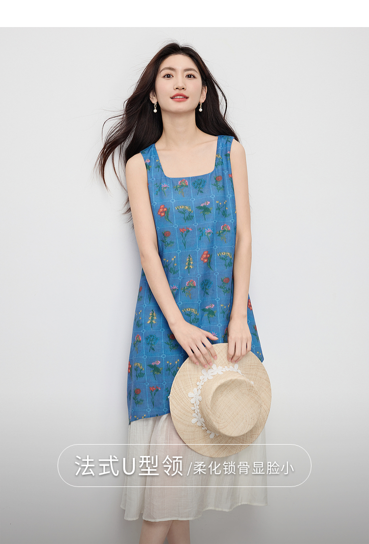 【07/30新品5.5折】熙世界植物印花假两件背心连衣裙女夏季新款法式方领拼接无袖裙子