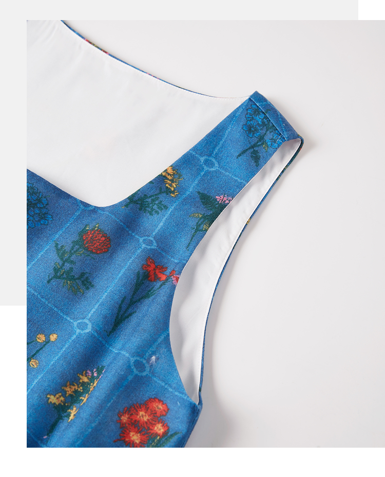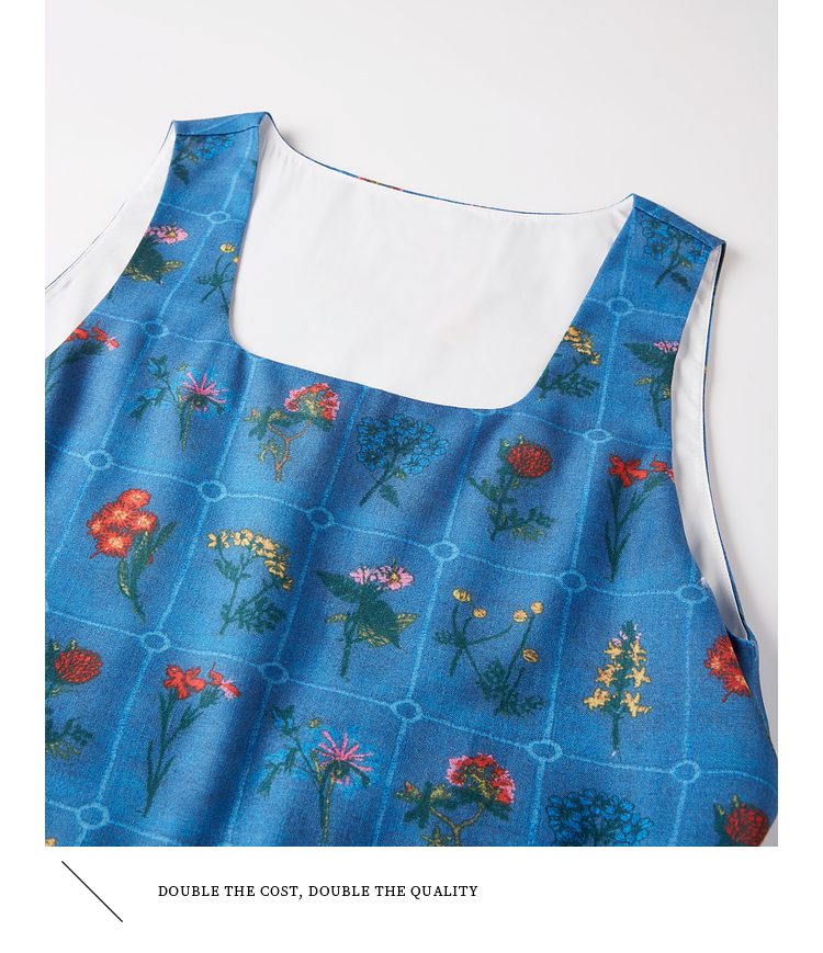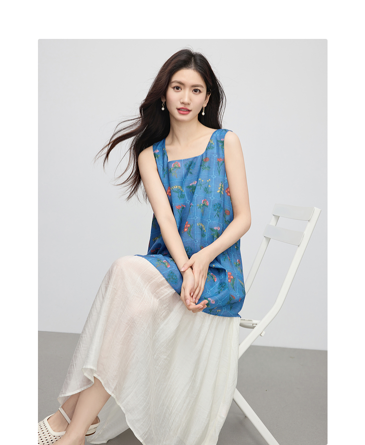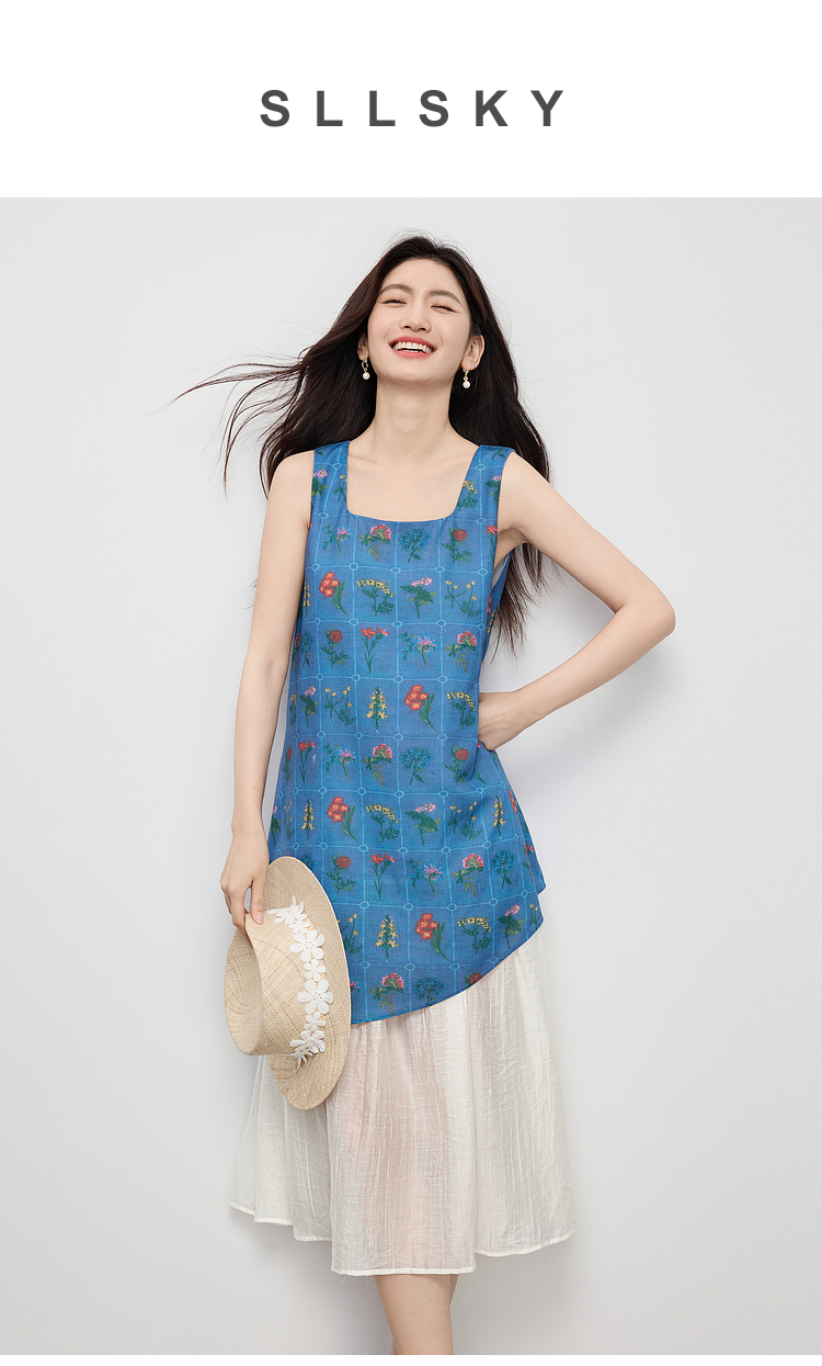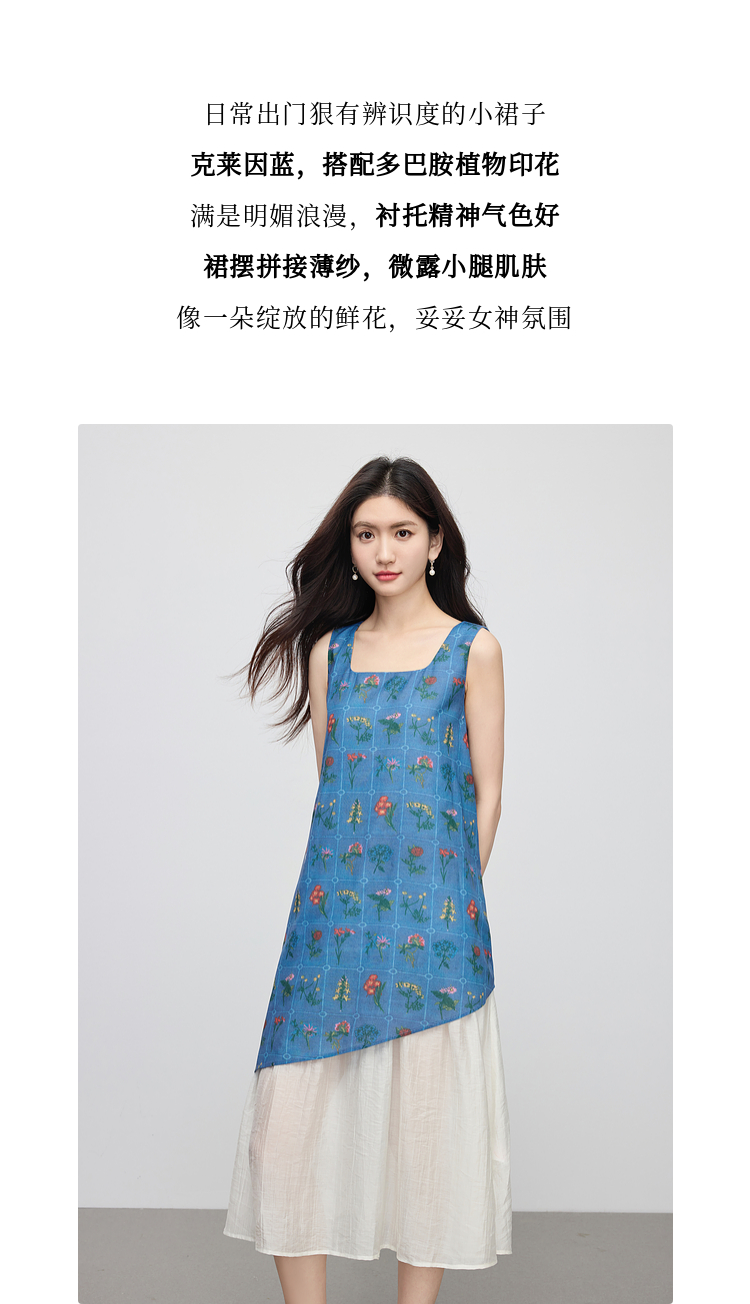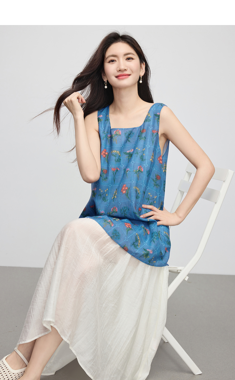 【07/30新品5.5折】熙世界植物印花假两件背心连衣裙女夏季新款法式方领拼接无袖裙子