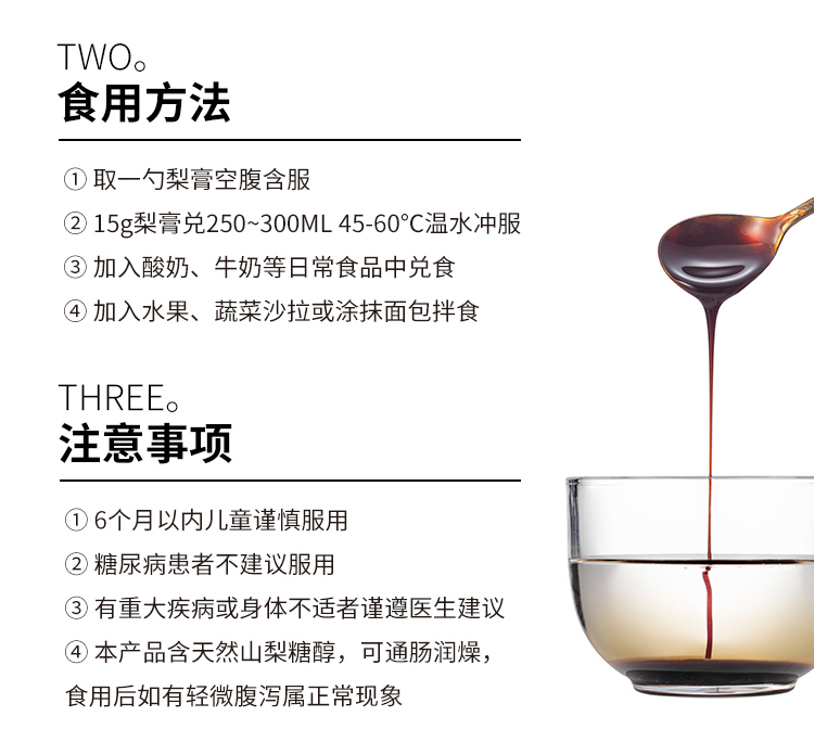 2、15g梨膏冲250~300ml 45-60℃温水冲复