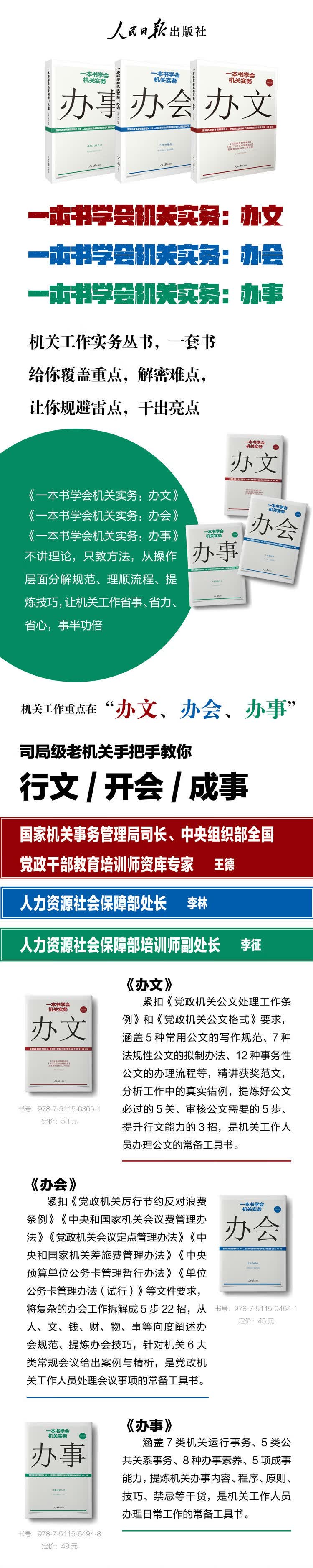 《一本书学会机关实务:办文》《一本书学会机关实务:办会》《一本书学会机关实务:办事》不讲理论,只教方法,从操作层面分解规范、理顺流程、提炼技巧,让机关工作省事、省力、省心,事半功倍