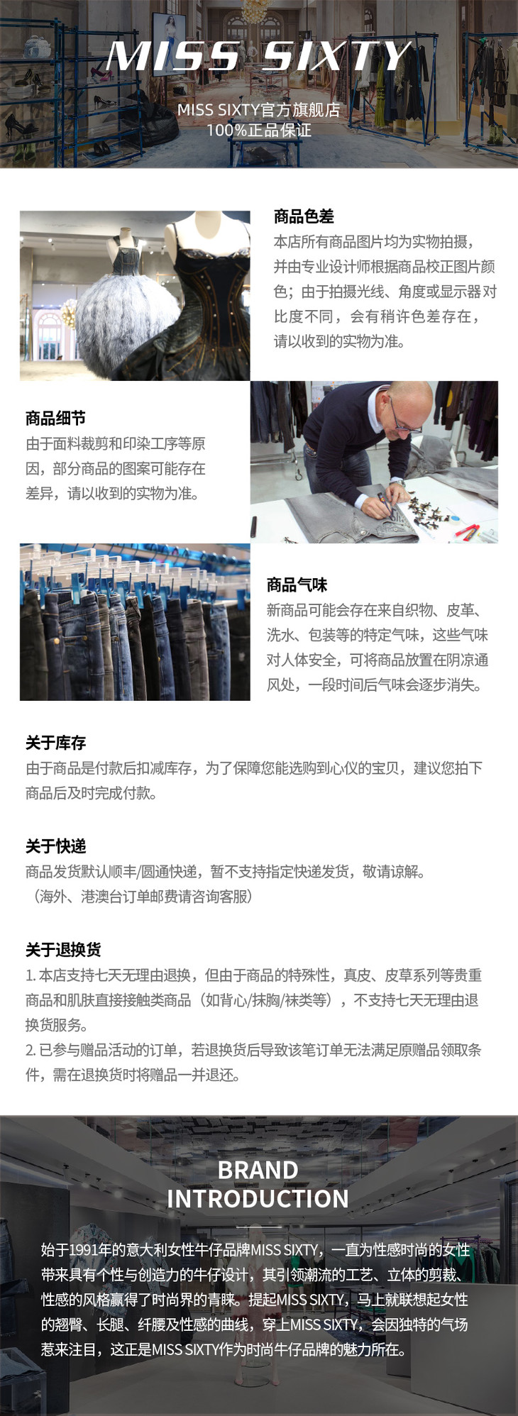4. 破洞做旧、破坏效果、装饰部位为人工处理,每件单品存在轻微差异,穿着和洗涤时请留意,避免穿着不当或用力揉搓、熨烫等,导致破洞增大或装饰脱落。