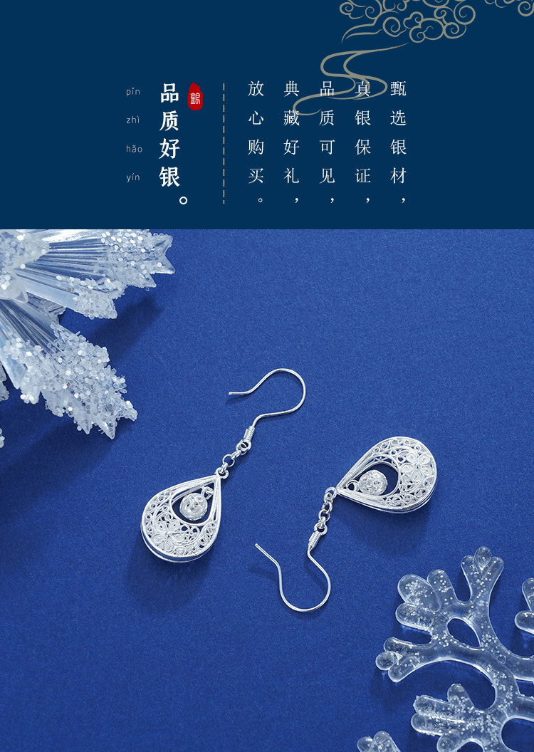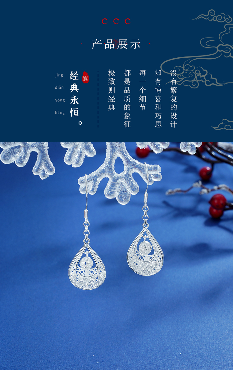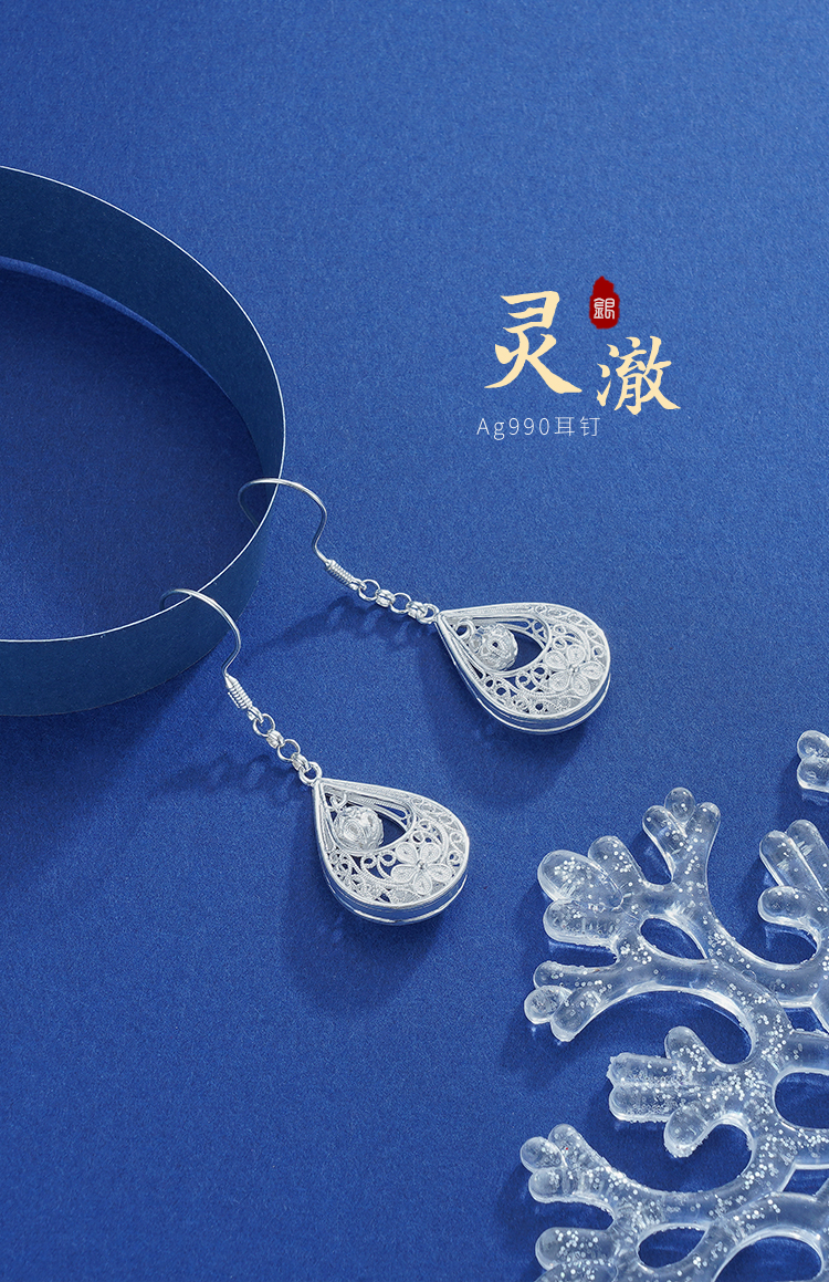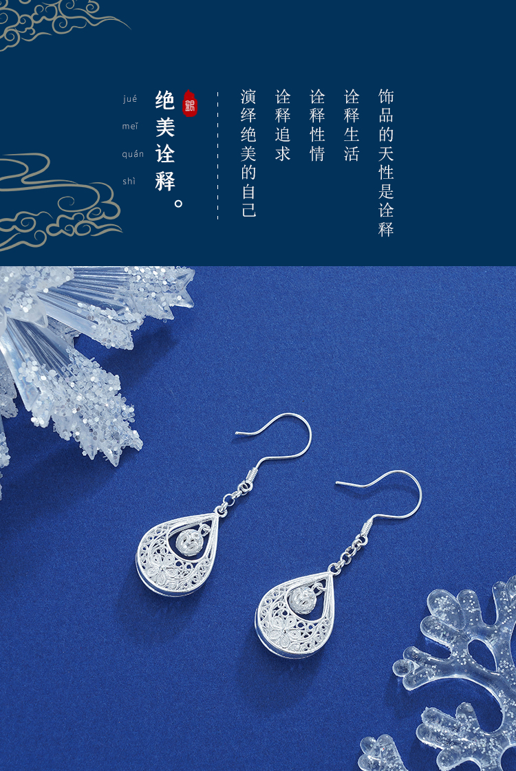 【寓意】:干净澄澈是对它的第一印象。耳环由花丝勾勒成琵琶形状。简约对称,空灵立体。光影在镂空结构中流动,魅力生生不息。