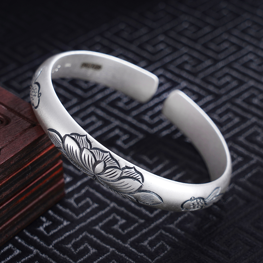 【寓意】:纯银开口手镯,镯面錾刻游鱼戏莲之景,莲鲤相映,寓意连年有余,富贵盈门。