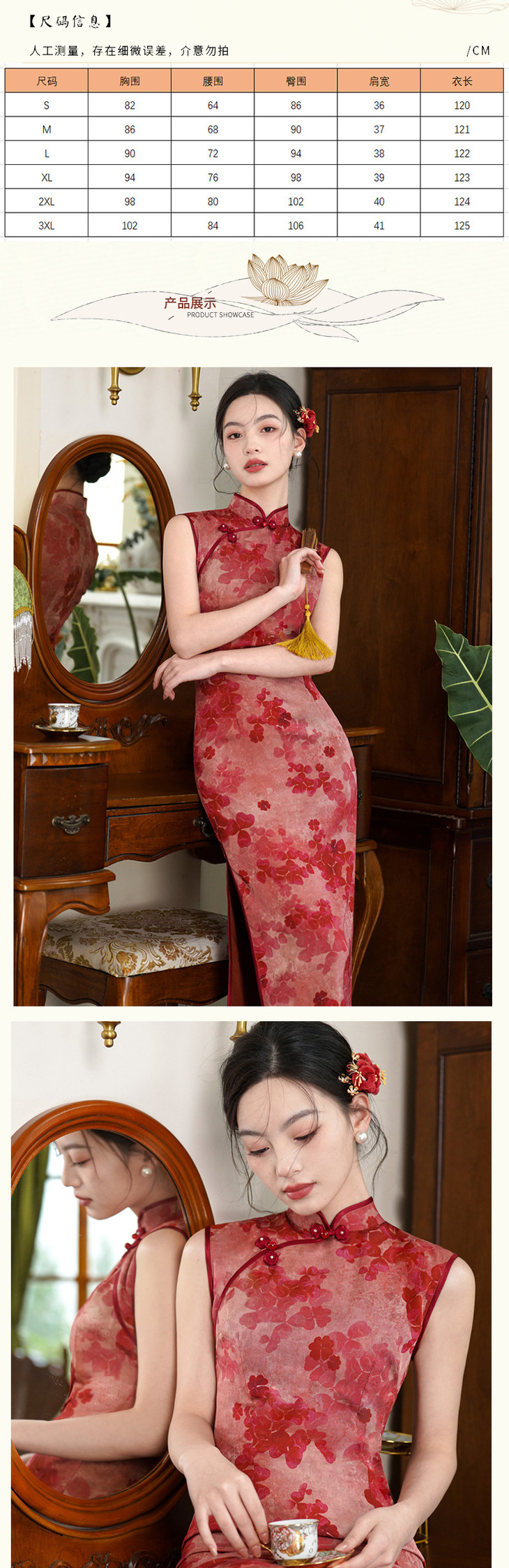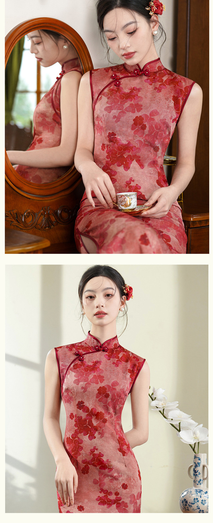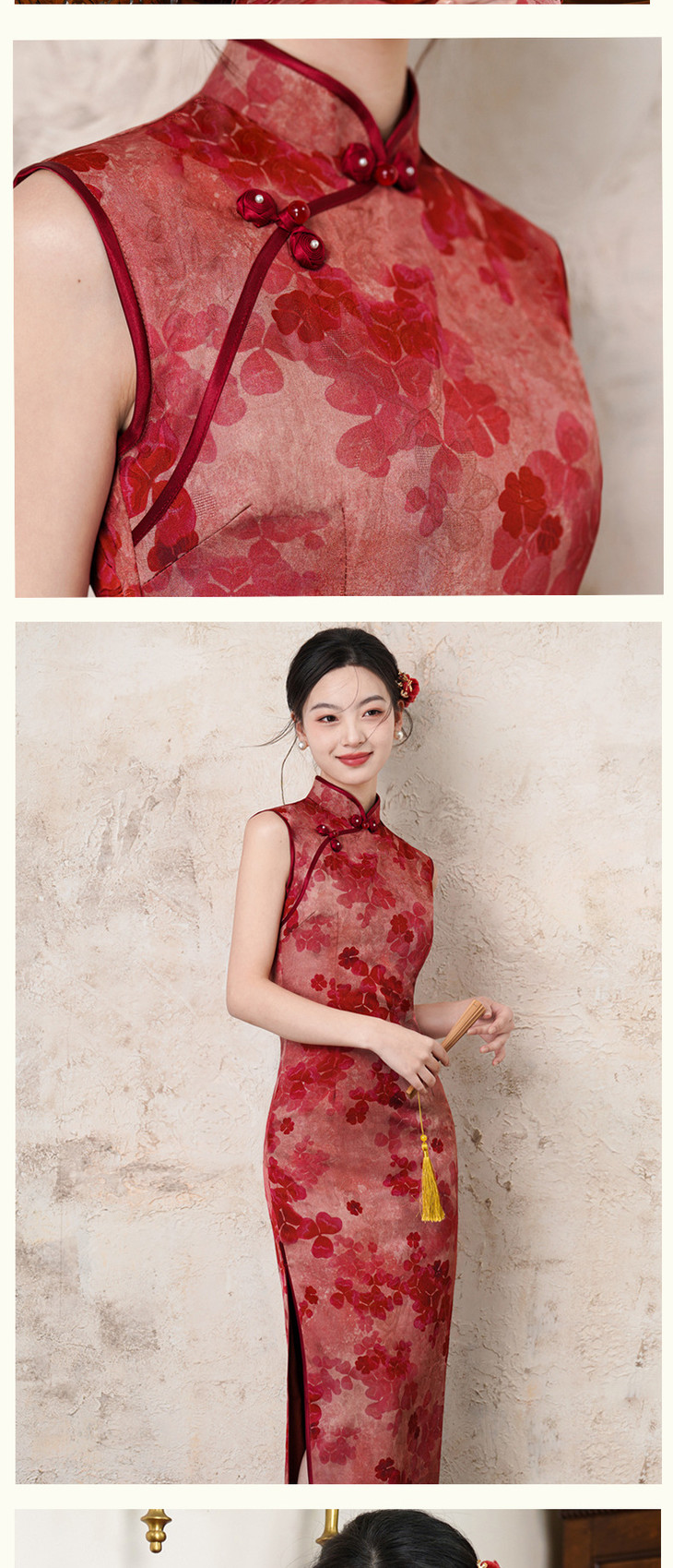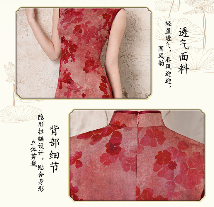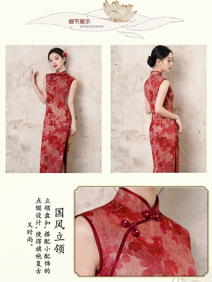 无袖仿醋酸提花长款红色复古清冷感气质旗袍SJT6064
