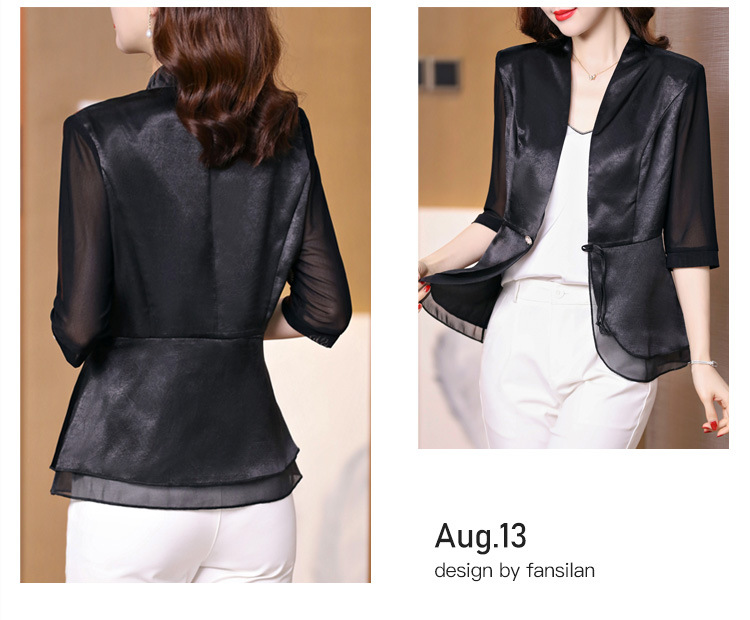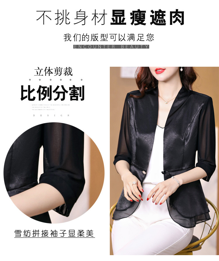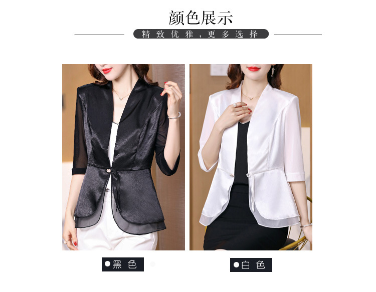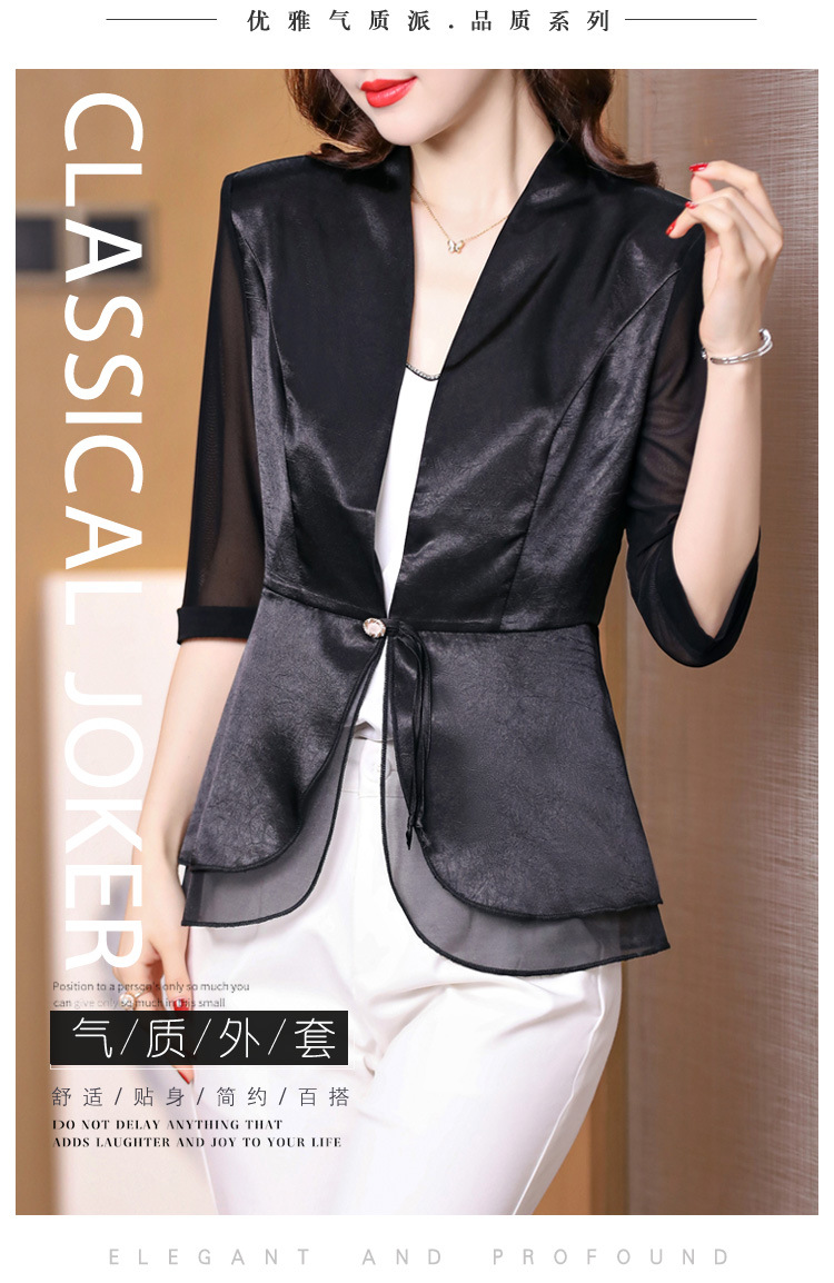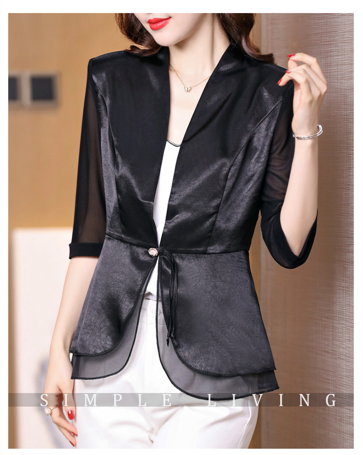时尚纯色,修身百搭修行显瘦缎面拼接网纱中袖外套KQL-2269