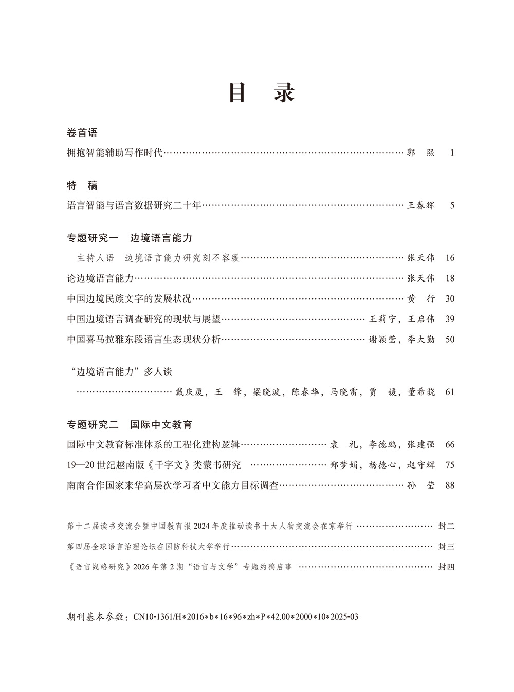 本期卷首语为张涌泉《写本文献是汉语字词的重要源头之一》。特稿为王春辉《语言智能与语言数据研究二十年》。专题研究包括两个主题:边境语言能力、国际中文教育。专题一在认识论和话语体系建构上,注重从边境研究到边境语言研究,聚焦边境语言能力的理论和实践,从不同维度探讨边境语言生活,包括1篇主持人语、4篇专题文章和1组多人谈。主持人语为张天伟《边境语言能力研究刻不容缓》;专题文章分别为张天伟《论边境语言能力》,黄行《中国边境民族文字的发展状况》,王莉宁、王启伟《中国边境语言调查研究的现状与展望》,谢颖莹、李大勤《中国喜马拉雅东段语言生态现状分析》;多人谈延请戴庆厦、梁晓波等资深专家学者对边境语言能力的重要性及提高方面进行了探讨。专题二包括袁礼、李德鹏、张建强《国际中文教育标准体系的工程化建构逻辑》,郑梦娟、杨德心、赵守辉《19—20 世纪初越南版〈千字文〉类蒙书研究》,孙莹《南南合作国家来华高层次学习者中文能力目标调查研究》3篇文章,从不同视角对国际中文教育里领域的成果和问题进行了研究论述。