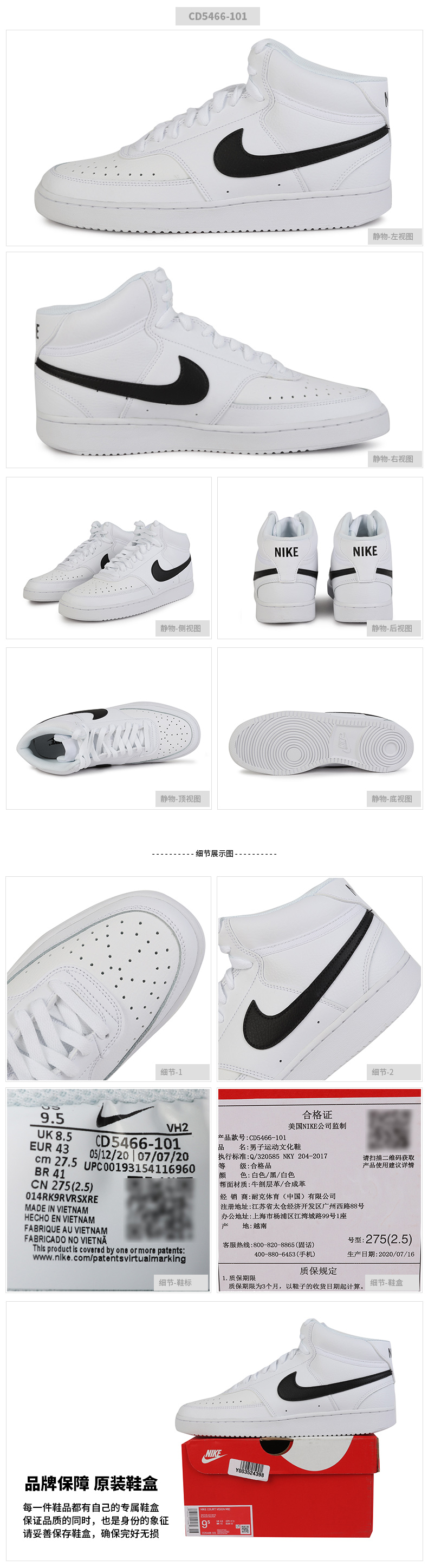 Nike/耐克 2020秋季 男款 空军一号 高帮 简版 运动 板鞋 休闲鞋 CD5466-101