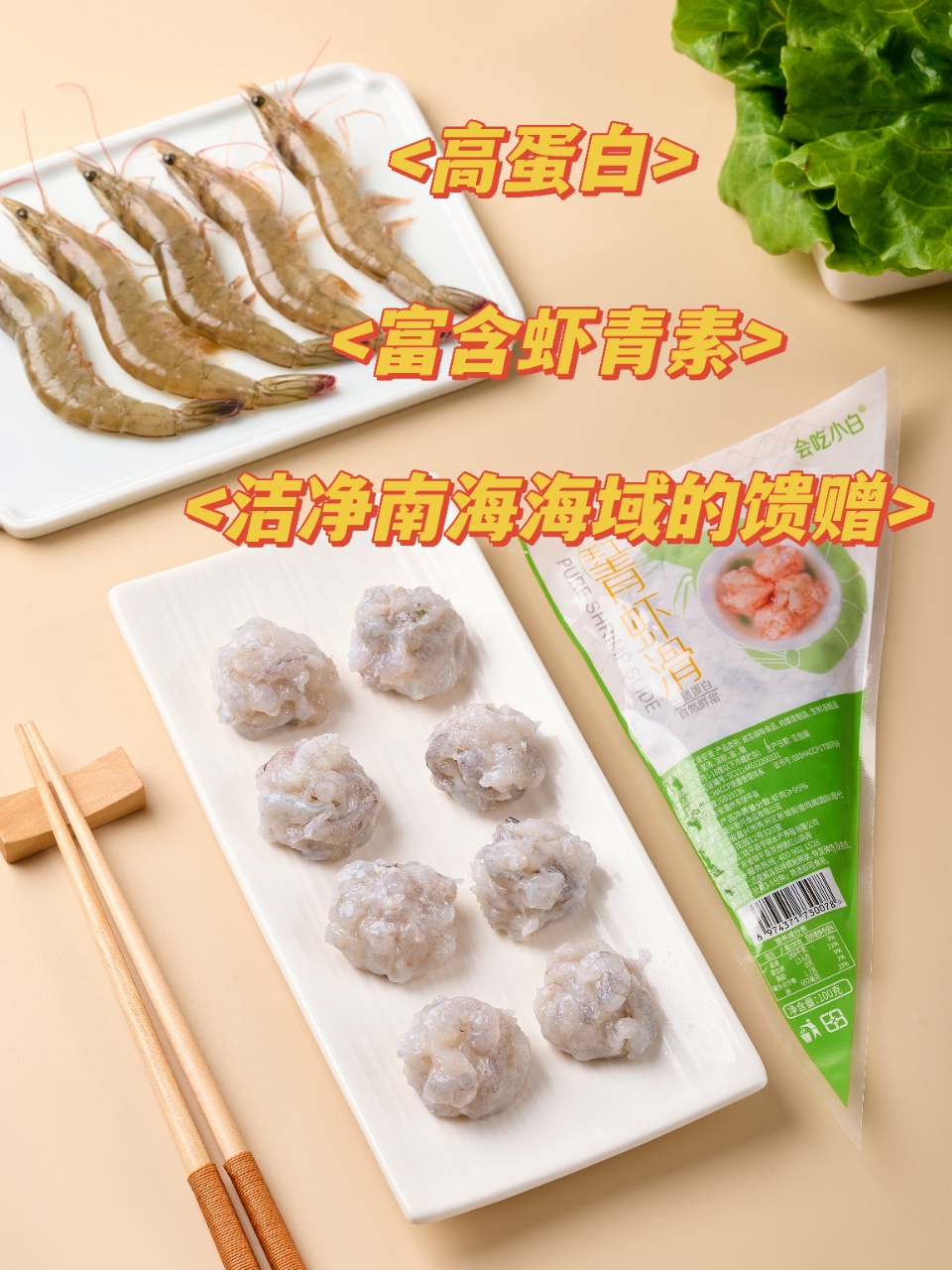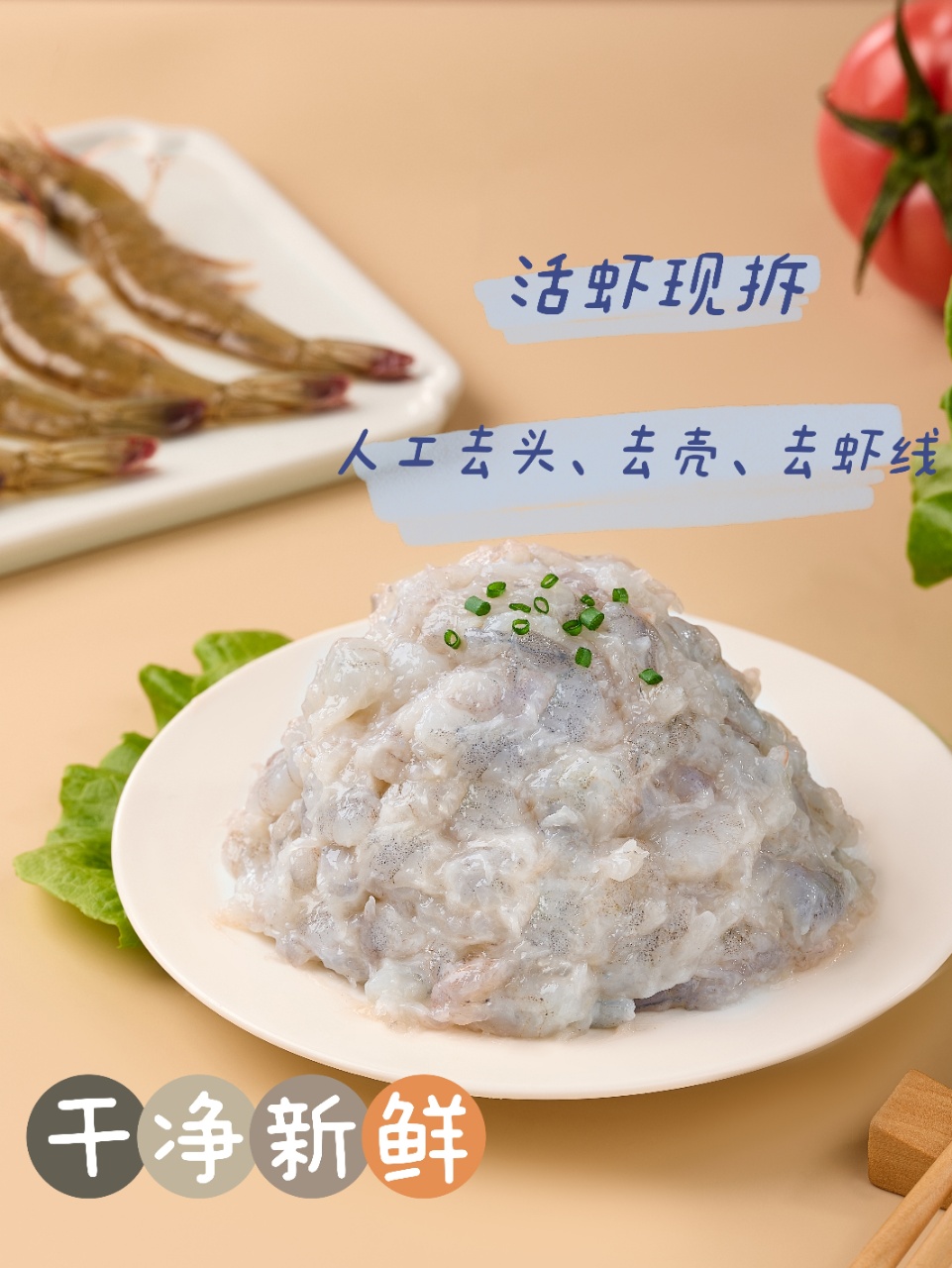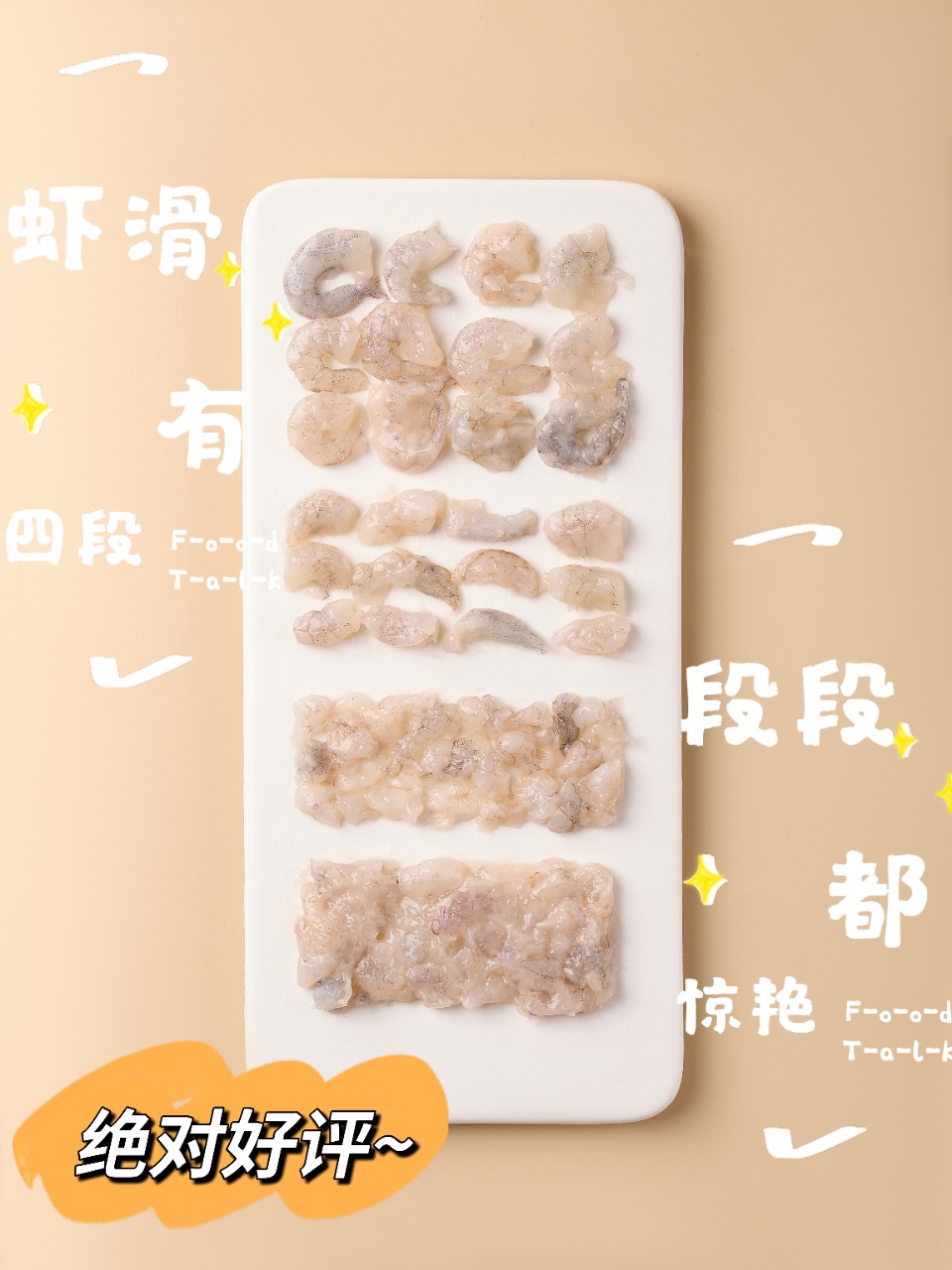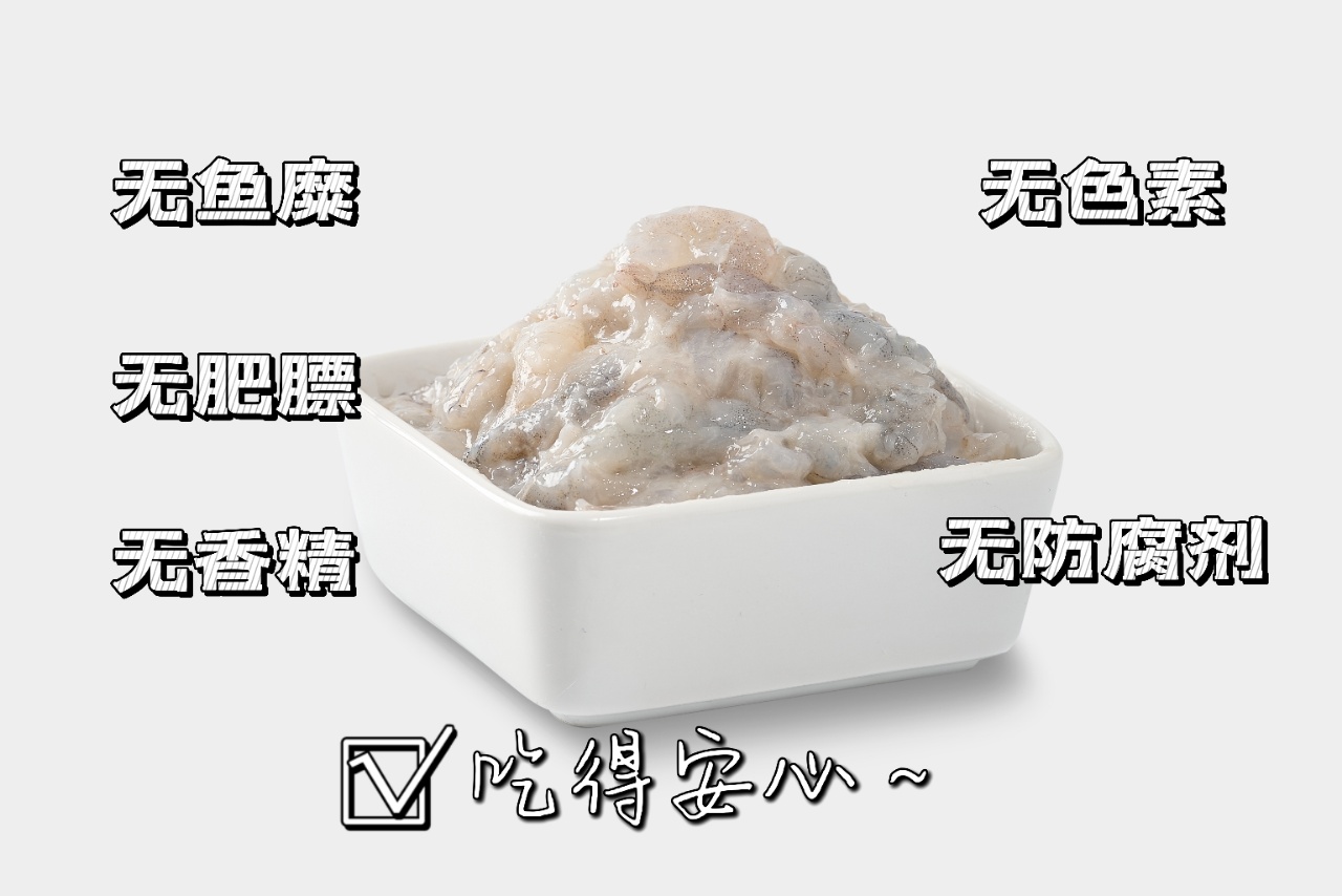 无鱼糜、无肥膘、无香精、无防腐剂、无色素,很好的保障了虾滑释放出更大程度的本味。
