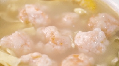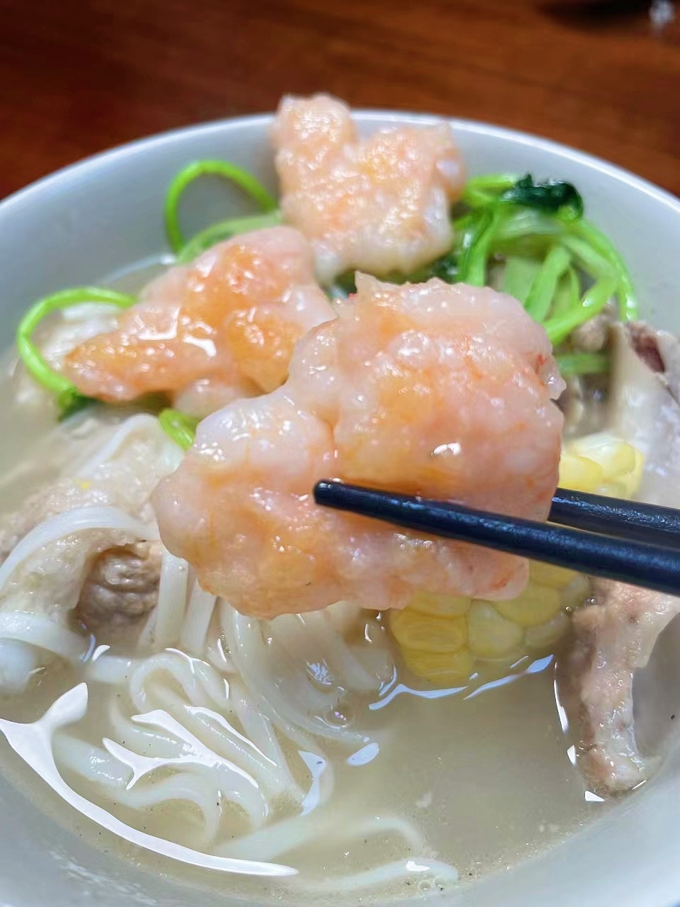 待到水沸,将包装袋剪开个口子,由上而下,挤出一个一个虾球,肉眼可见的虾段,虾粒、虾靡,甚至是——不小的整虾,凝聚成一个个在汤里翻滚的晶莹球球。