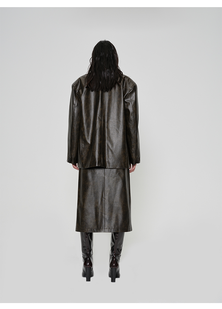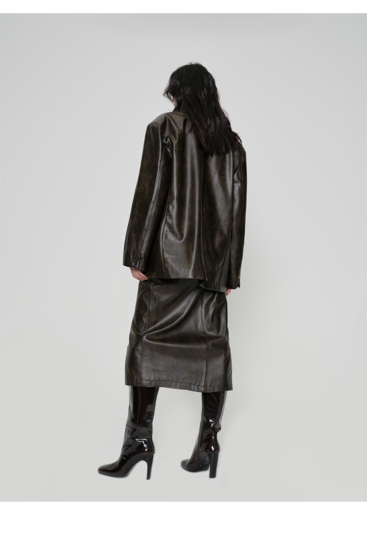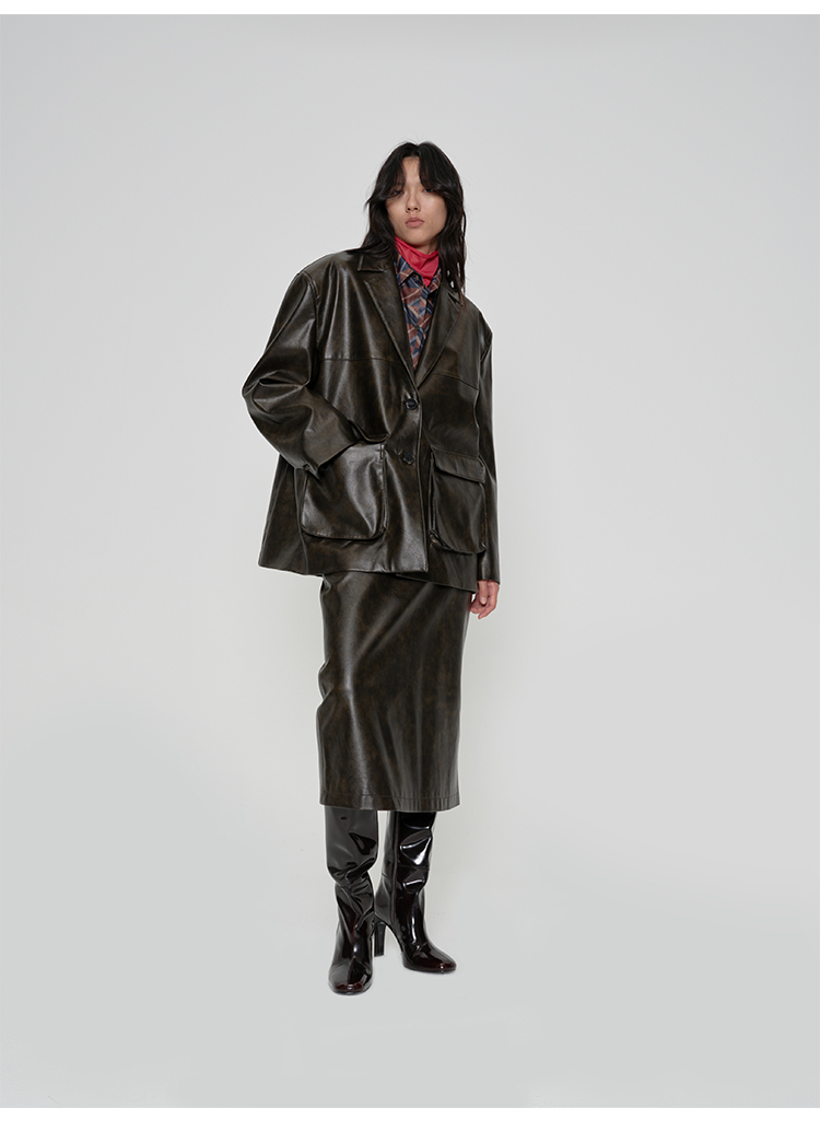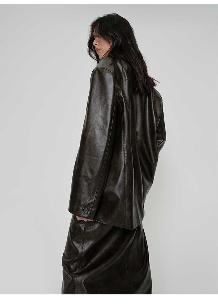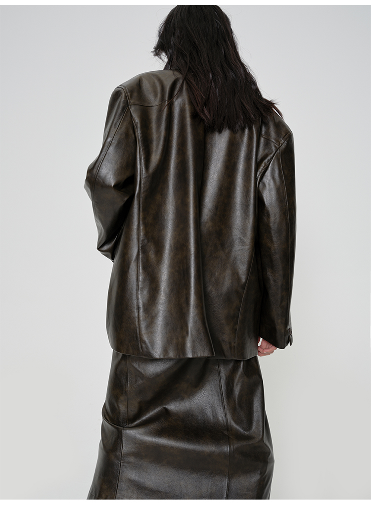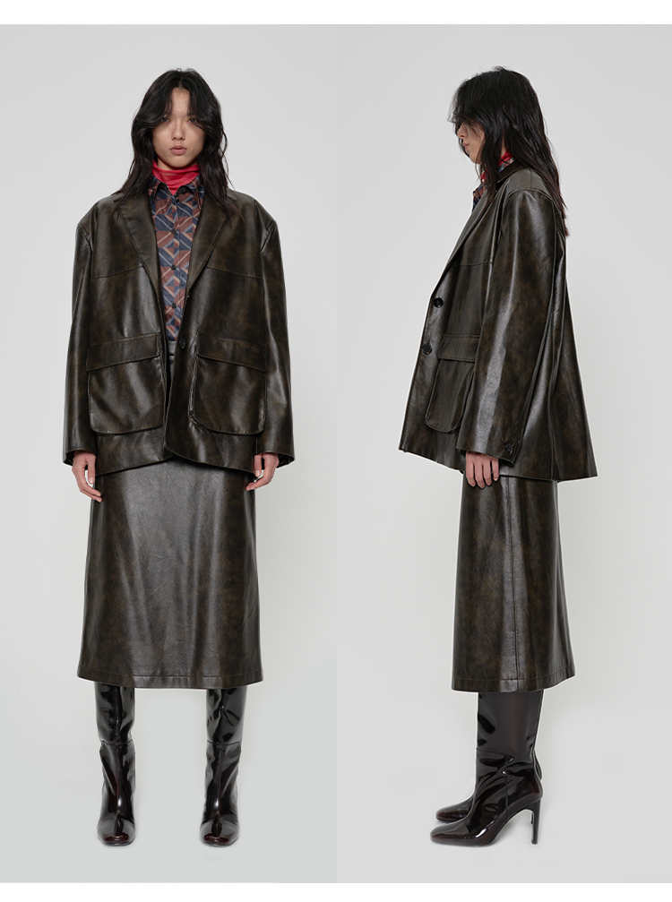 HIDEMI 【吴千语同款】甄选复古水洗擦色感环保蛋白皮工装感立体大口袋西装外套皮衣