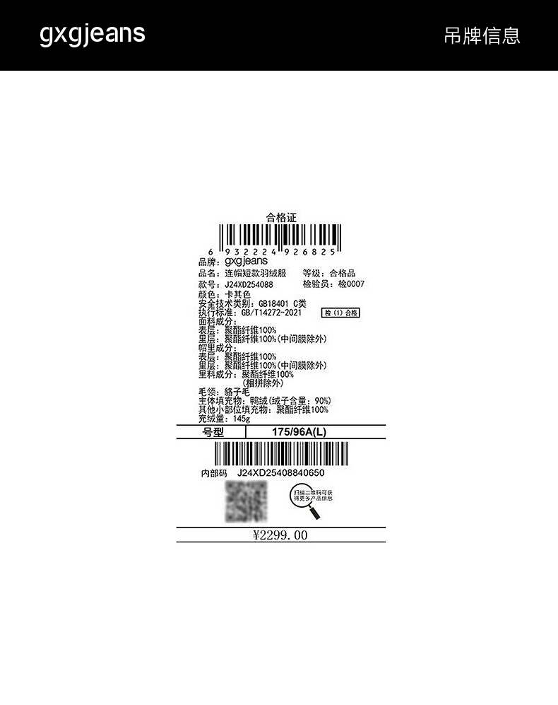 gxg.jeans男装 冬季热卖连帽短款羽绒服J24XD254088