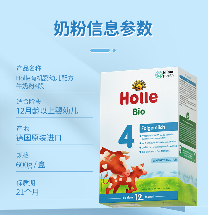Holle(泓乐)有机幼儿配方奶粉4段600g(12月龄以上)德国原装进口 保税仓发货 欧盟有机认证 效期到2026-8-27 含税价(未税价:199元/盒)