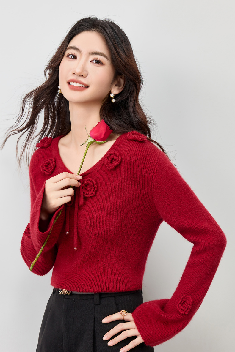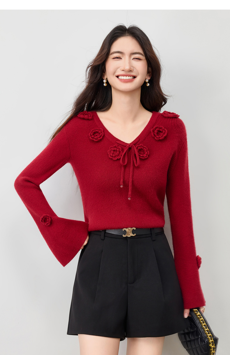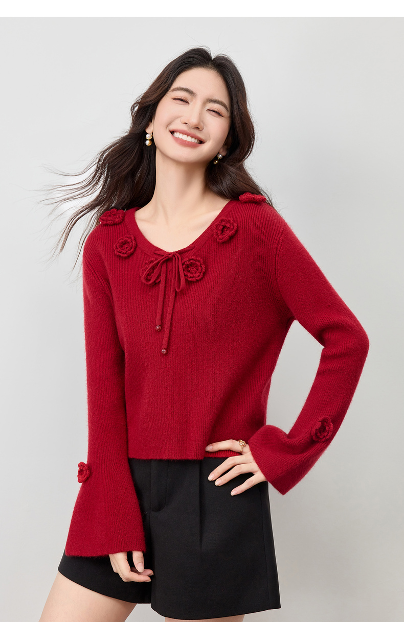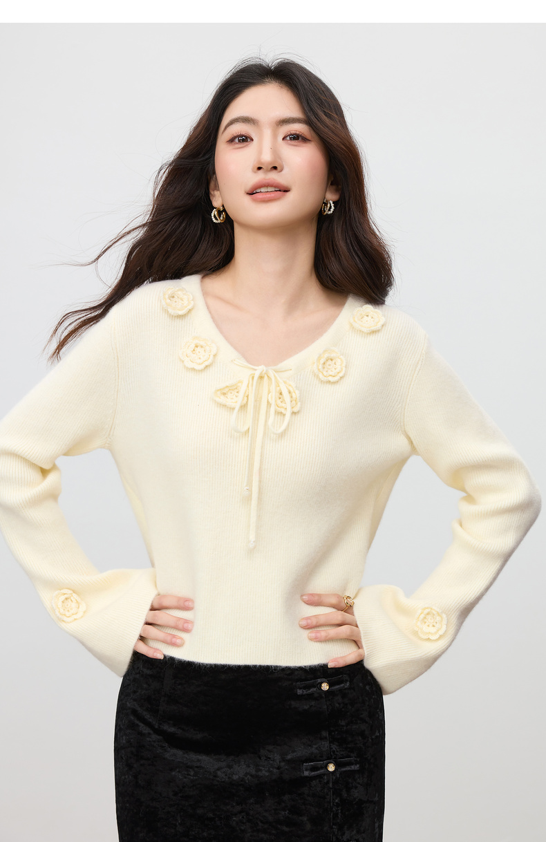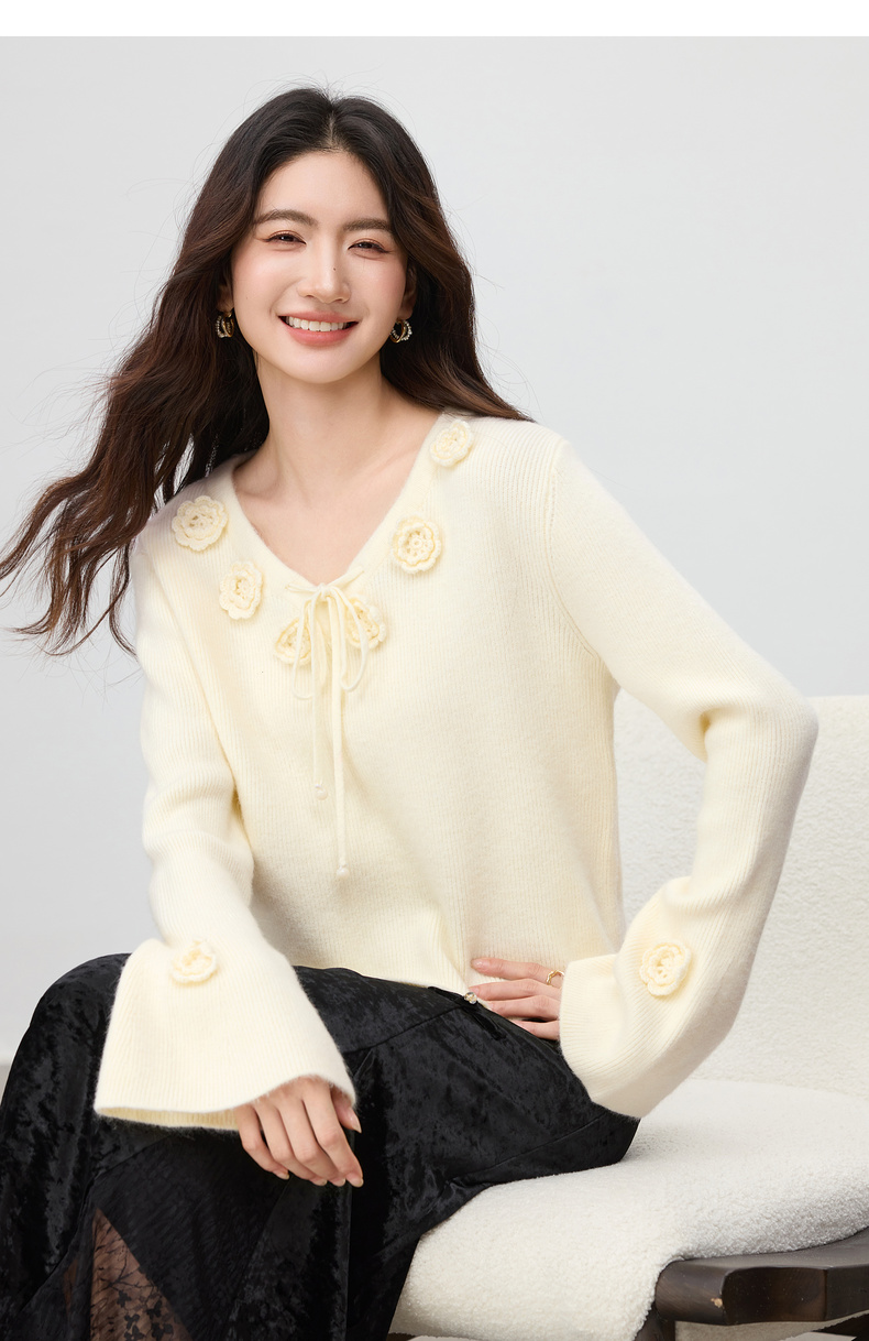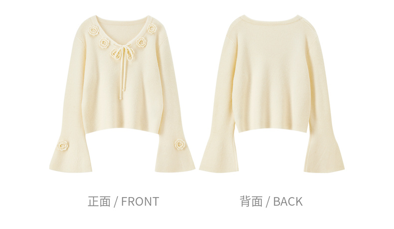 【内购】【立体玫瑰花】浪漫优雅V领钩花珠子系带喇叭袖含绵羊毛弹力毛衣-W54EG3951