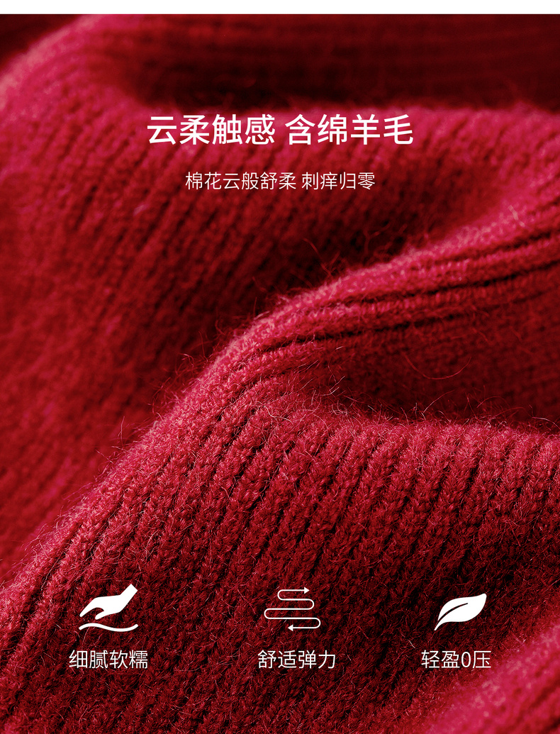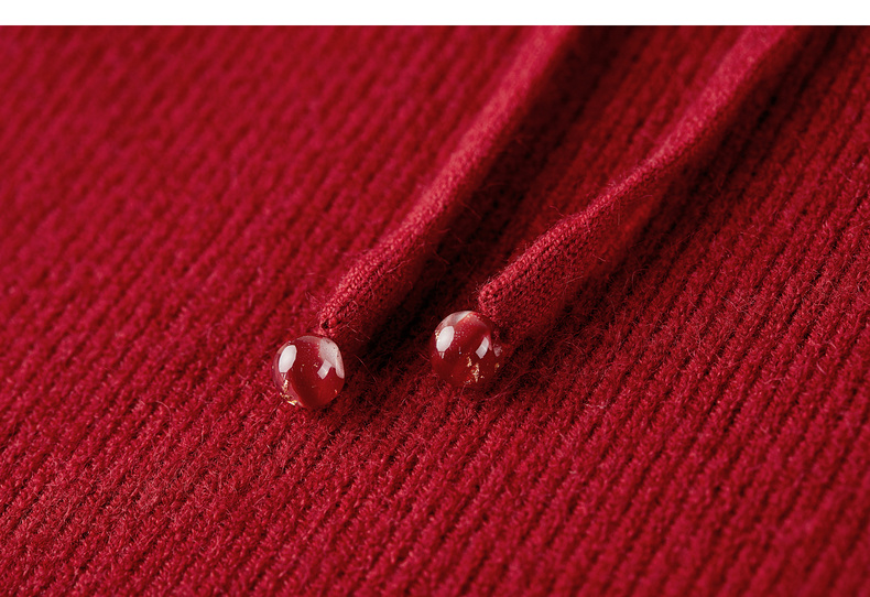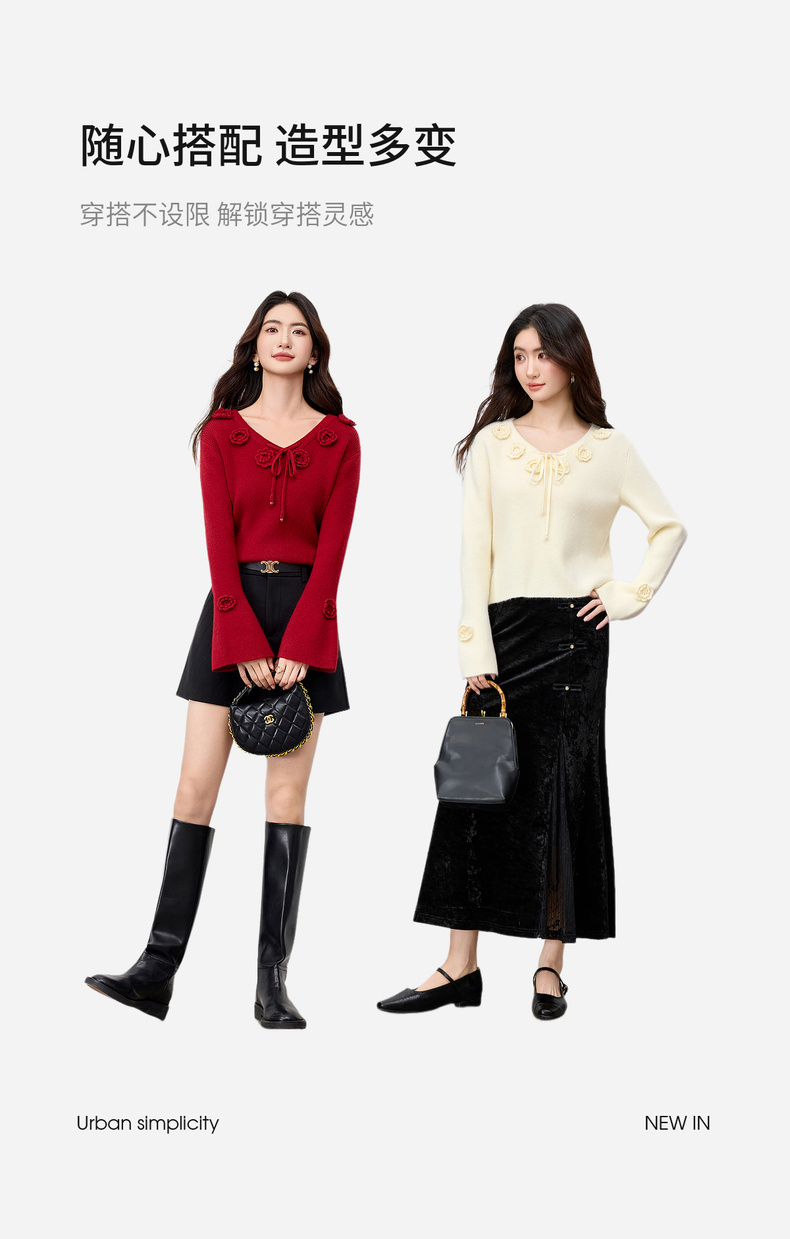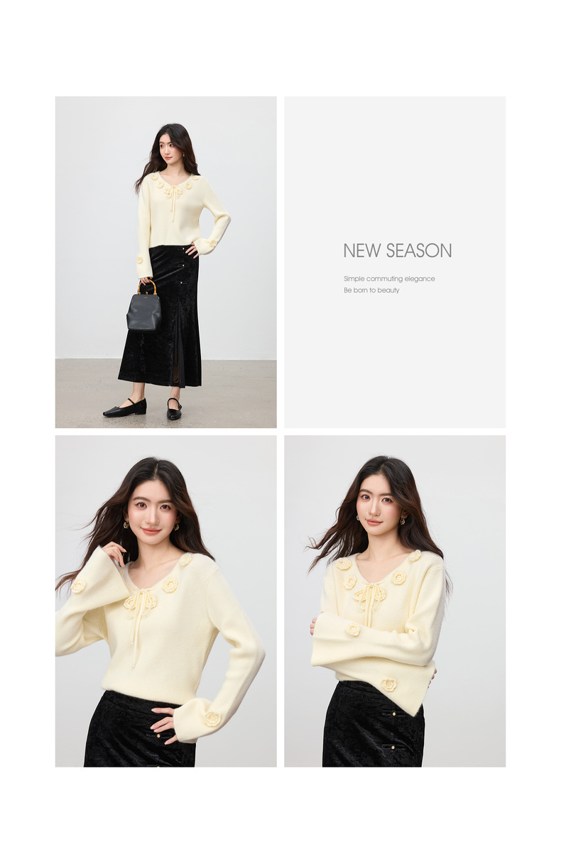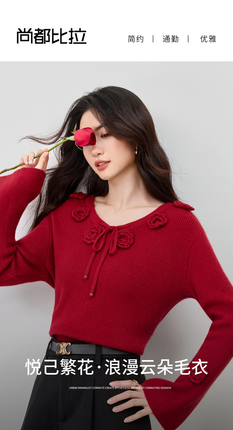 【内购】【立体玫瑰花】浪漫优雅V领钩花珠子系带喇叭袖含绵羊毛弹力毛衣-W54EG3951