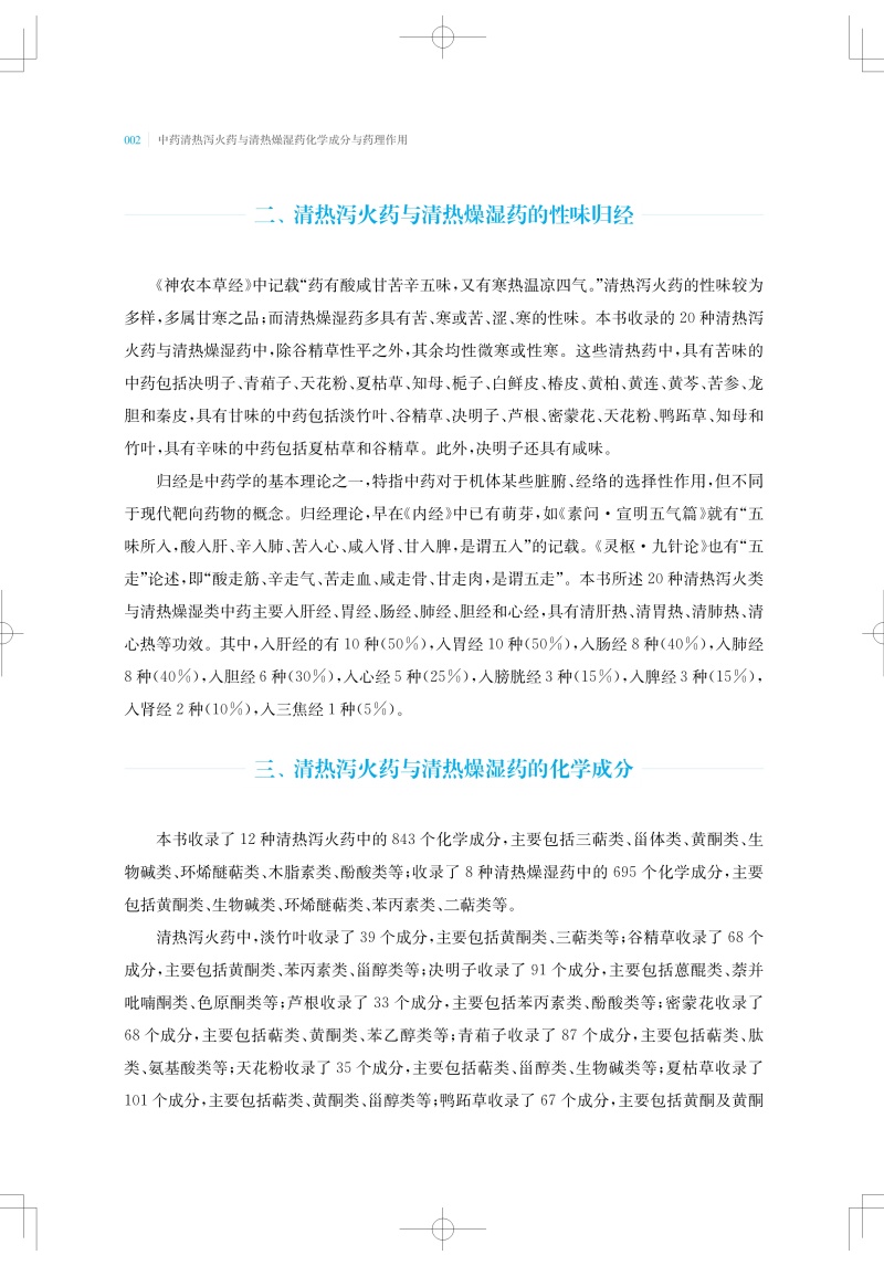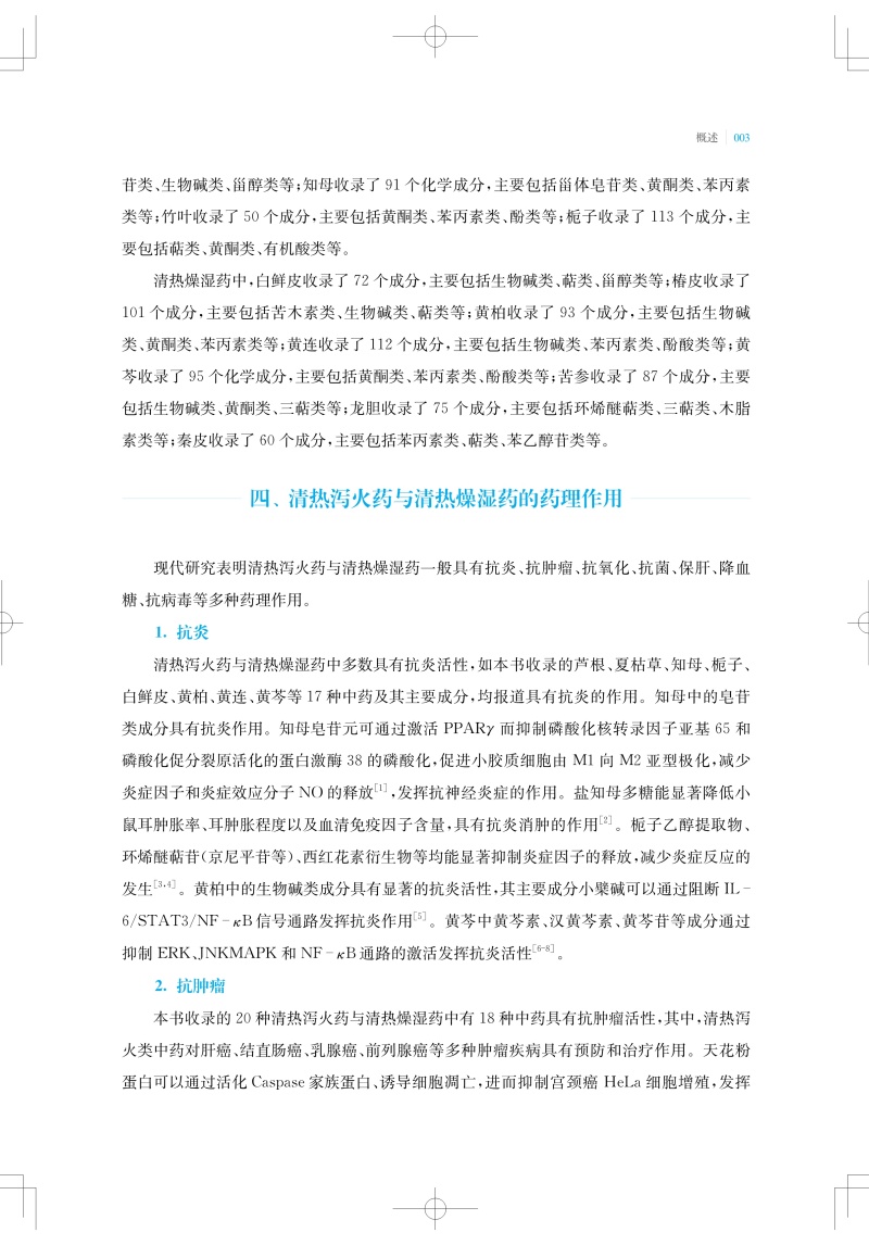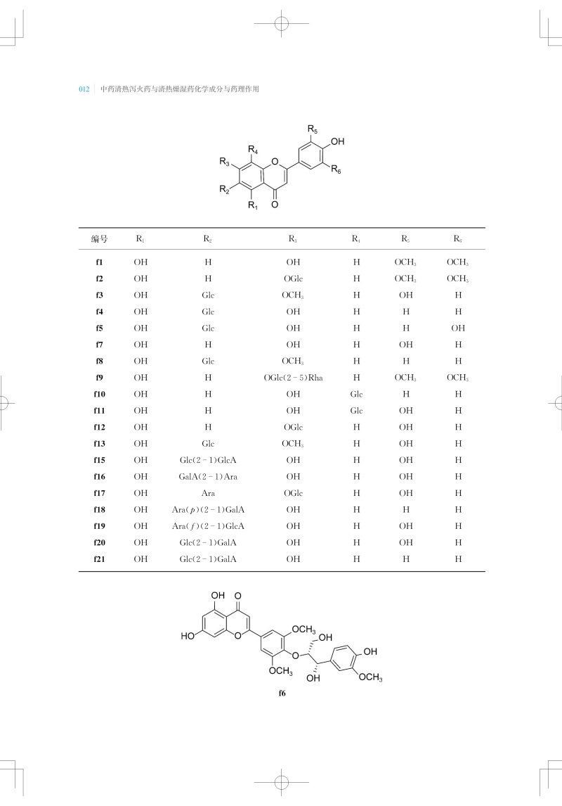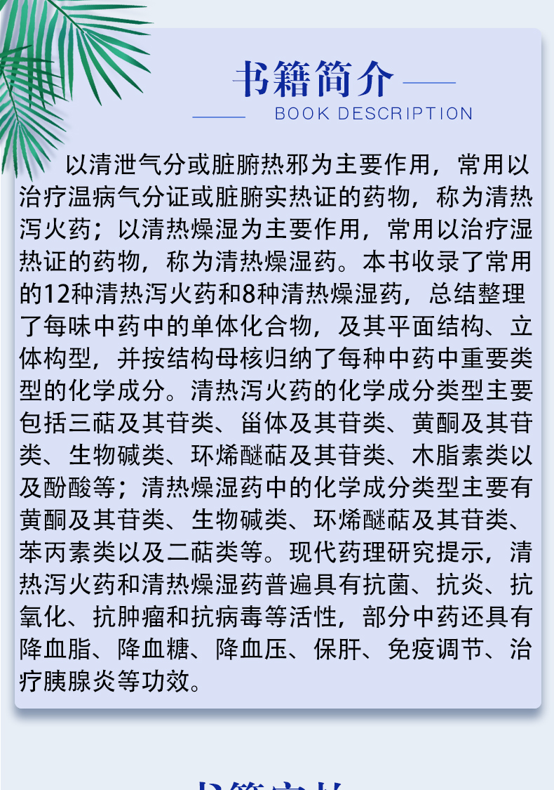 以清泄气分或脏腑热邪为主要作用,常用以治疗温病气分证或脏腑实热证的药物,称为清热泻火药;以清热燥湿为主要作用,常用以治疗湿热证的药物,称为清热燥湿药。本书收录了常用的12种清热泻火药和8种清热燥湿药,总结整理了每味中药中的单体化合物,及其平面结构、立体构型,并按结构母核归纳了每种中药中重要类型的化学成分。清热泻火药的化学成分类型主要包括三萜及其苷类、甾体及其苷类、黄酮及其苷类、生物碱类、环烯醚萜及其苷类、木脂素类以及酚酸等;清热燥湿药中的化学成分类型主要有黄酮及其苷类、生物碱类、环烯醚萜及其苷类、苯丙素类以及二萜类等。现代药理研究提示,清热泻火药和清热燥湿药普遍具有抗菌、抗炎、抗氧化、抗肿瘤和抗病毒等活性,部分中药还具有降血脂、降血糖、降血压、保肝、免疫调节、治疗胰腺炎等功效。