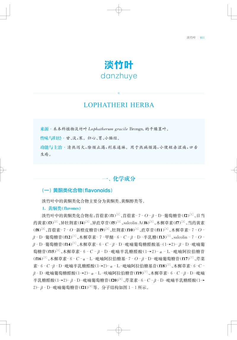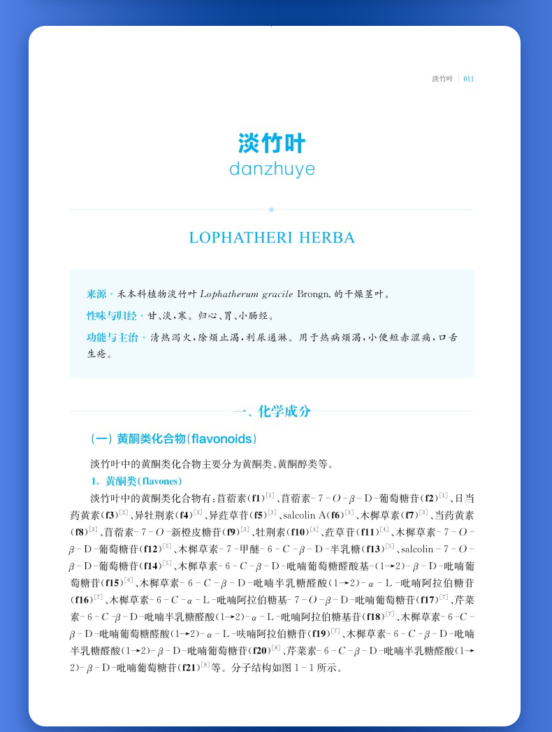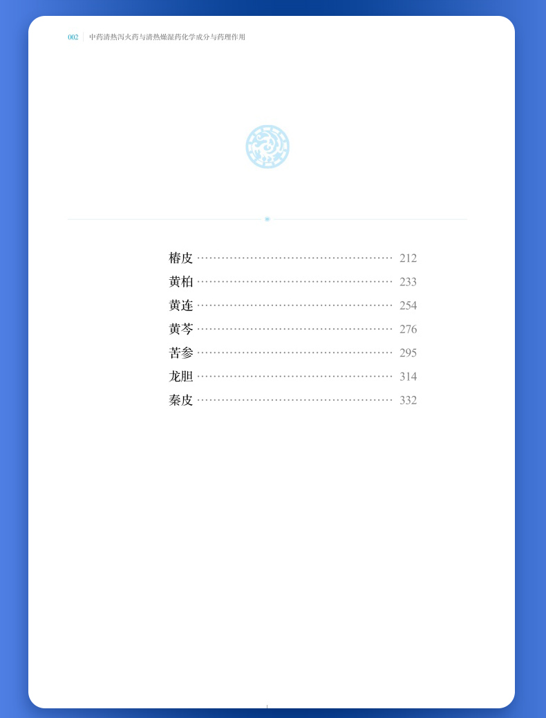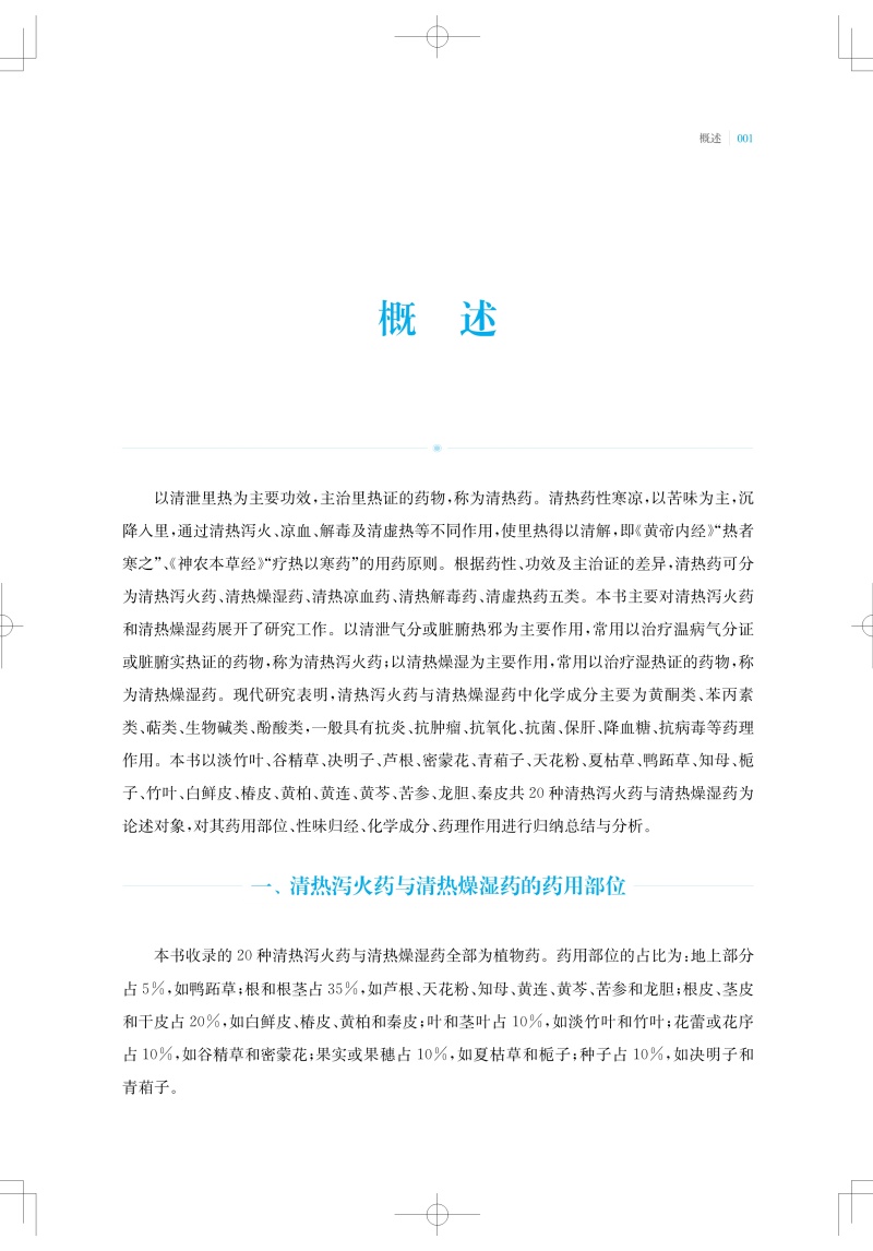 以清泄气分或脏腑热邪为主要作用,常用以治疗温病气分证或脏腑实热证的药物,称为清热泻火药;以清热燥湿为主要作用,常用以治疗湿热证的药物,称为清热燥湿药。本书收录了常用的12种清热泻火药和8种清热燥湿药,总结整理了每味中药中的单体化合物,及其平面结构、立体构型,并按结构母核归纳了每种中药中重要类型的化学成分。清热泻火药的化学成分类型主要包括三萜及其苷类、甾体及其苷类、黄酮及其苷类、生物碱类、环烯醚萜及其苷类、木脂素类以及酚酸等;清热燥湿药中的化学成分类型主要有黄酮及其苷类、生物碱类、环烯醚萜及其苷类、苯丙素类以及二萜类等。现代药理研究提示,清热泻火药和清热燥湿药普遍具有抗菌、抗炎、抗氧化、抗肿瘤和抗病毒等活性,部分中药还具有降血脂、降血糖、降血压、保肝、免疫调节、治疗胰腺炎等功效。