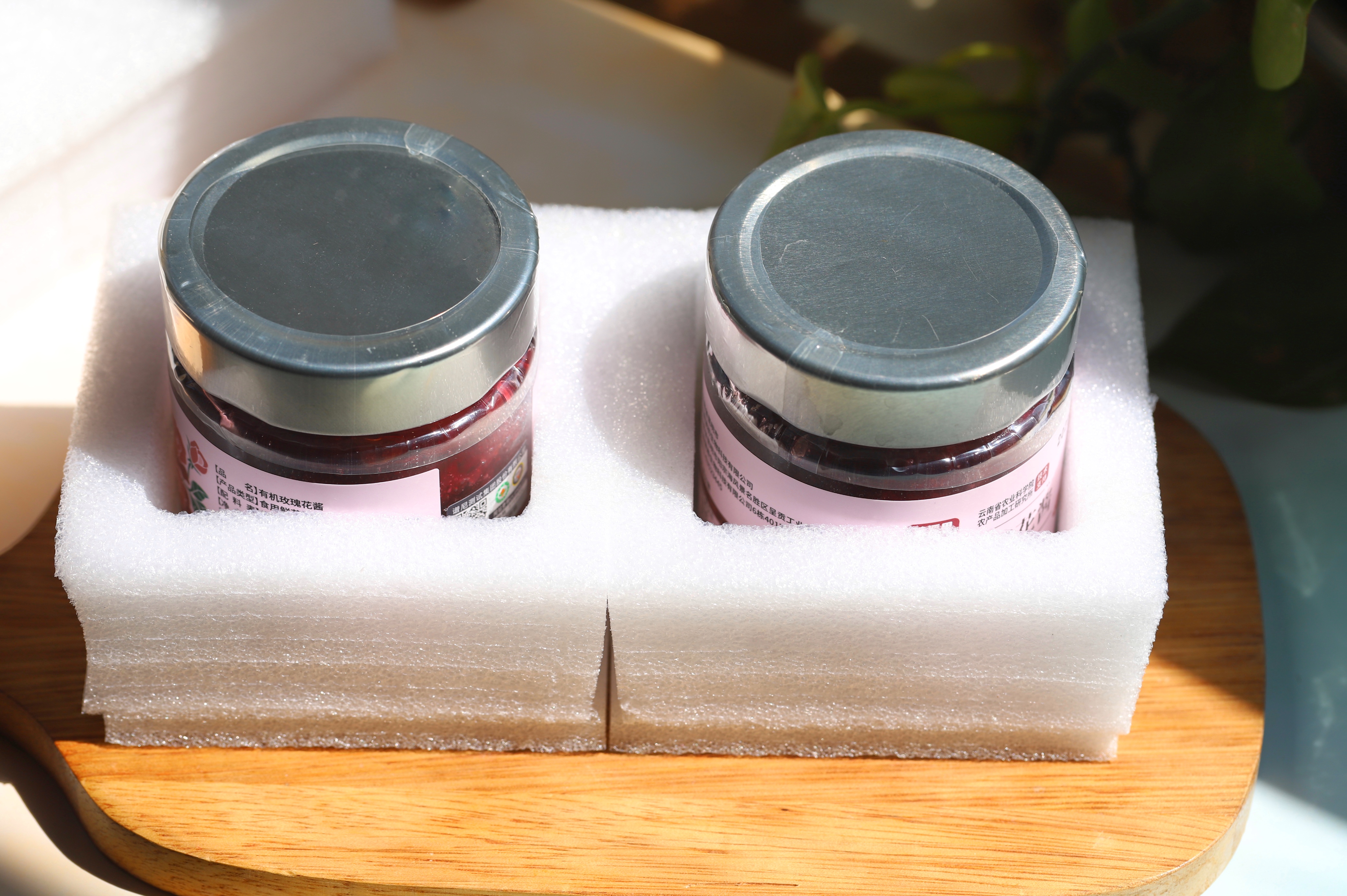 【产品包装】:瓶装玫瑰酱/定制防震泡沫托/5层打包纸箱