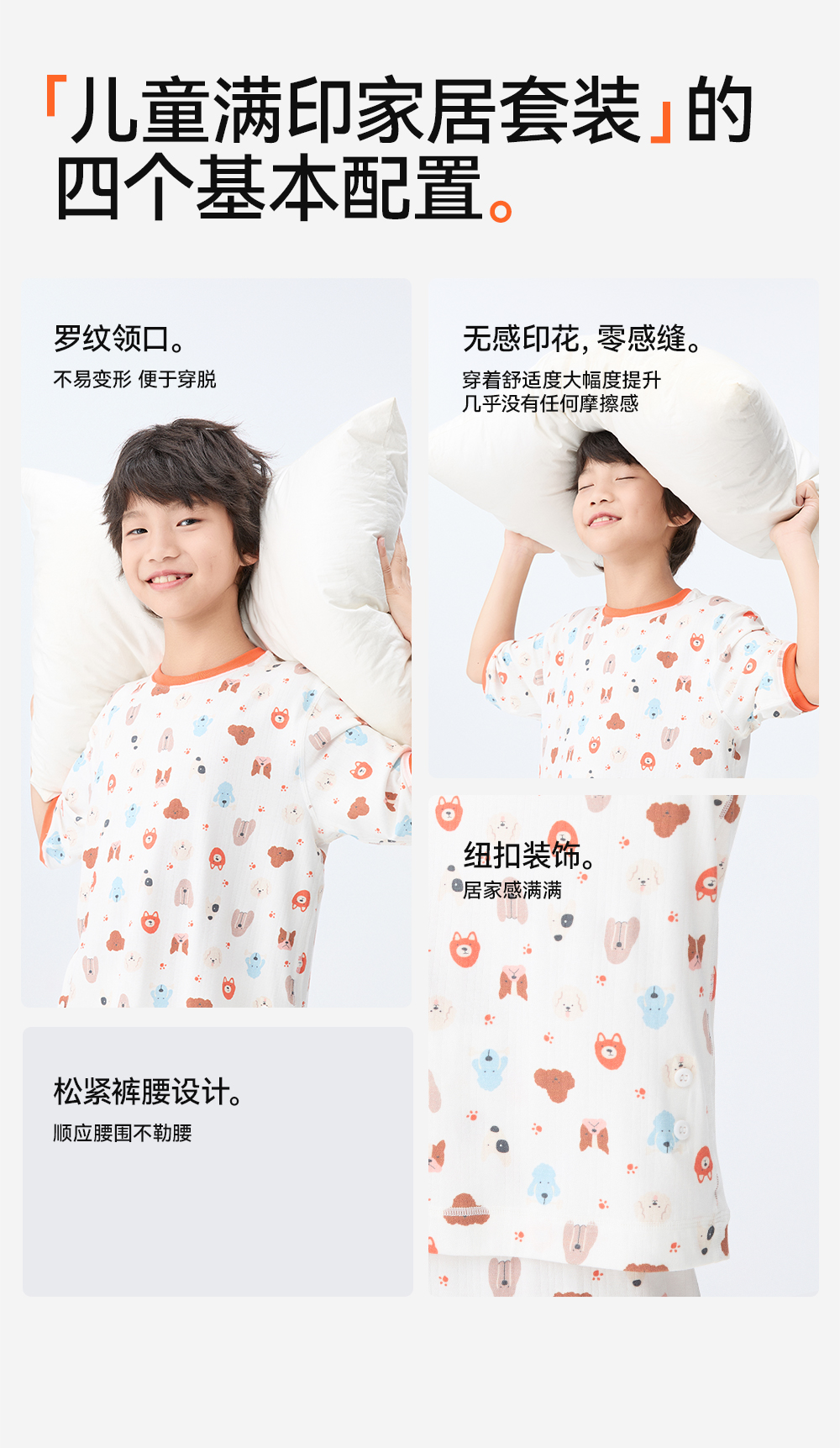 护肚扭扣设计,睡觉防踢被着凉;四针六线走线,细节做工精致;胶印水洗标,不摩擦皮肤罗纹领口,不易变形,便于穿脱。