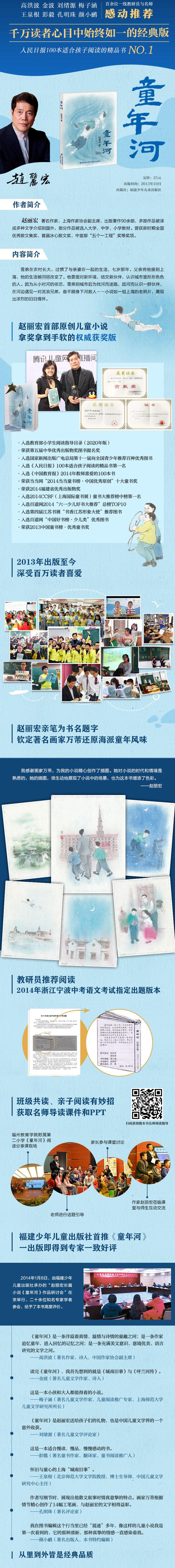《童年河》是赵丽宏先生创作的第一部儿童成长小说,故事讲的是:小主人公雪弟从小在农村长大,过惯了与亲婆(祖母)在一起的生活,突然有一天父亲将他接到上海,他的生活被改变了。他要面对新环境,结交新伙伴,认识城市形形色色的人,面对许许多多新事物……小说以雪弟充满童真的视角来观察这个世界,因为从小对河的依恋,到城市后他为找河而迷路,因为河而认识一群伙伴,在河边遇见一对流浪兄弟,在桥上打赌跳水,还奋不顾身从河里救人等等。故事总是无意中将河拉入到我们的视野当中,正是一条河将雪弟从农村慢慢“渡”到城市,让他通过“河”这个媒介接纳新环境,完成了一次不平凡的成长。