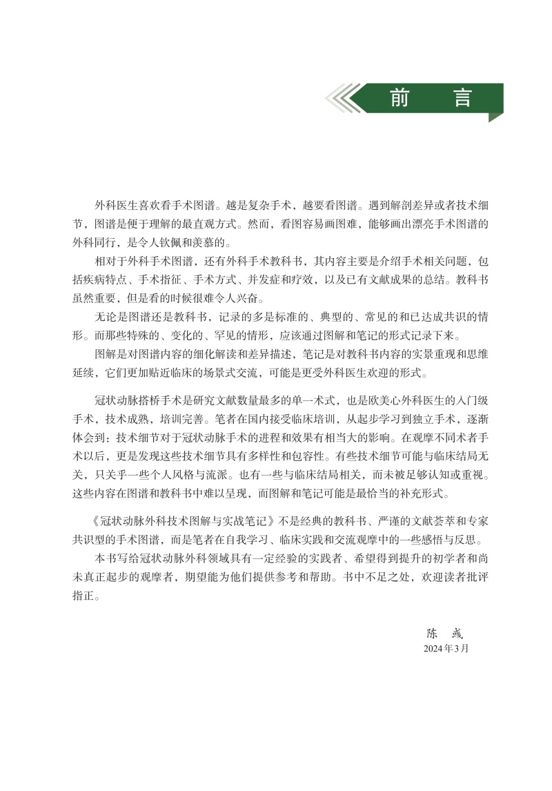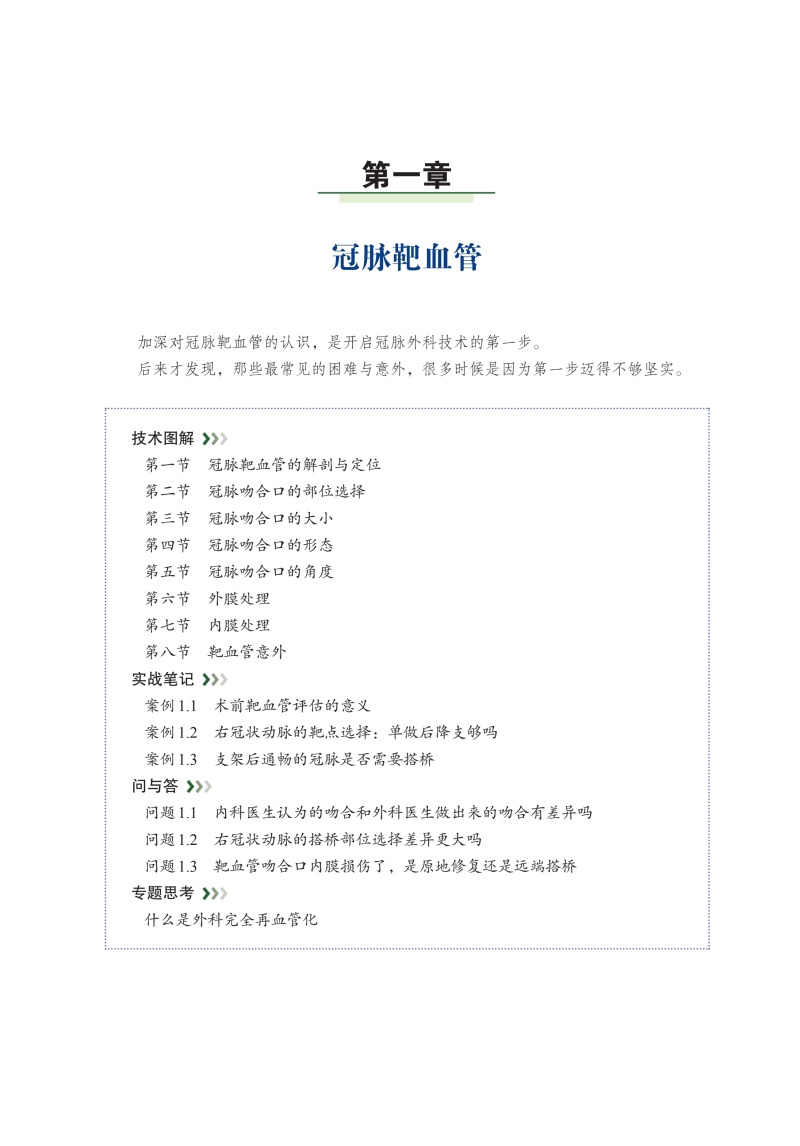 本书将以图解和笔记的形式,直观而新颖,力求为广大致力于心脏外科事业的中青年医师提供一部实用技术的教材式著作,也给资深心外科同行展示在冠脉外科技术领域的深入思考与探索。