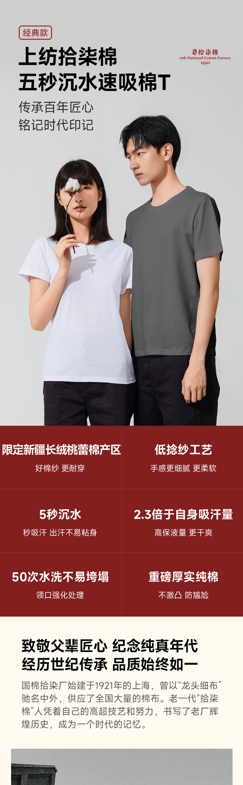 男女同款T恤【婴儿肌肤般触感 秒吸水 透气舒爽】百年上纺拾柒棉 桃蕾棉T恤 比毛巾还吸水 不透肉 不垮塌 衣领加固工艺 百搭有型