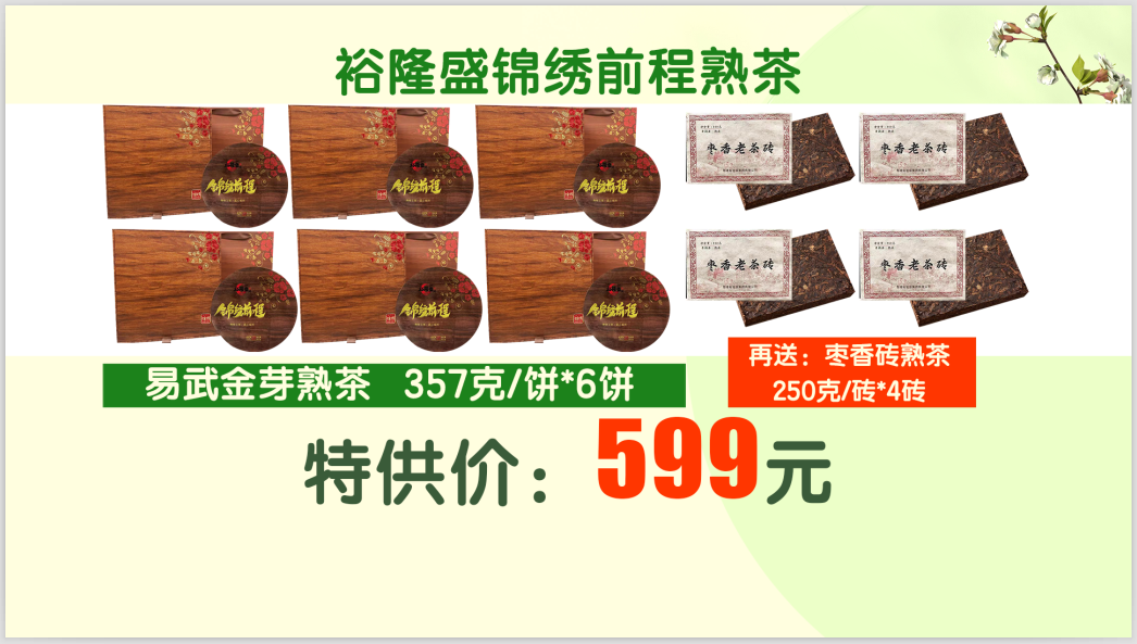 易武刮风寨熟茶357克/饼+插针*6、枣香砖熟茶250克/砖*4、手提袋*6