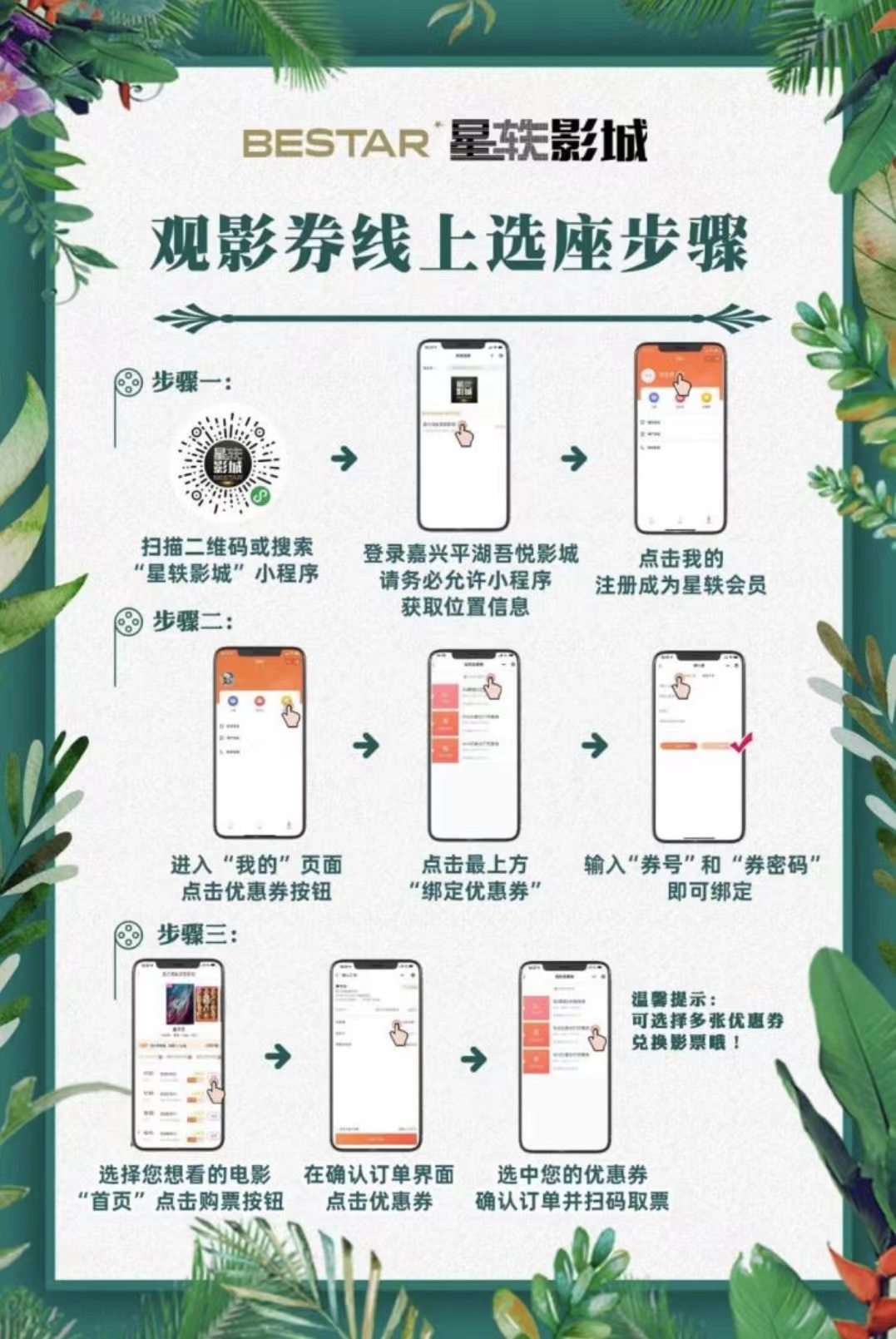 2.请在有效期内登录【星轶影城】小程序绑定电子券,操作步骤如下图所示: