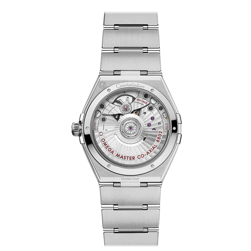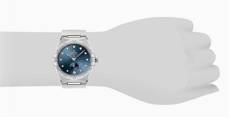 镜面材质 | 蓝宝石水晶玻璃 | 表盘 | 精钢表壳 表圈镌刻罗马数字刻度,孔雀蓝表盘呈现太阳射线打磨效果,6点位设有圆形日历窗。 递增的钻石小时刻度悉心镶嵌于白色18K金托槽内,小秒盘和中央分钟圈饰以圆环。指针、欧米茄品牌标识以及星徽标志均以白色18K金打造。 日期显示 背透 |