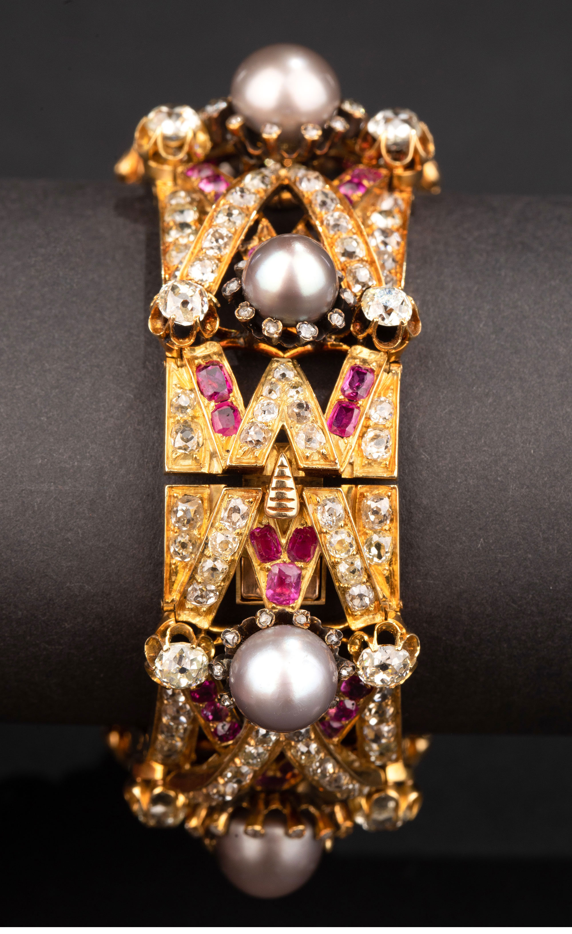 1858年法国珠宝大师出品黄金镶嵌天然海水珍珠及红宝石钻石手链