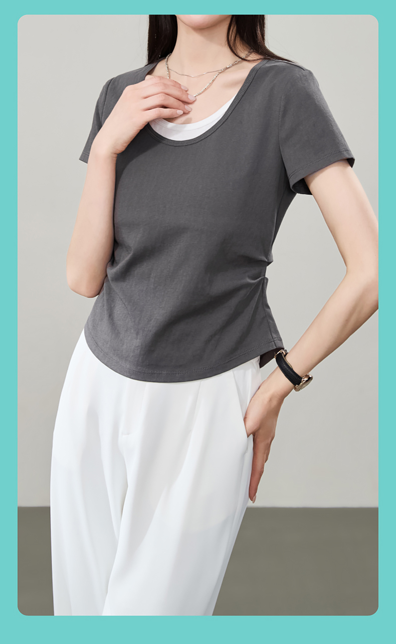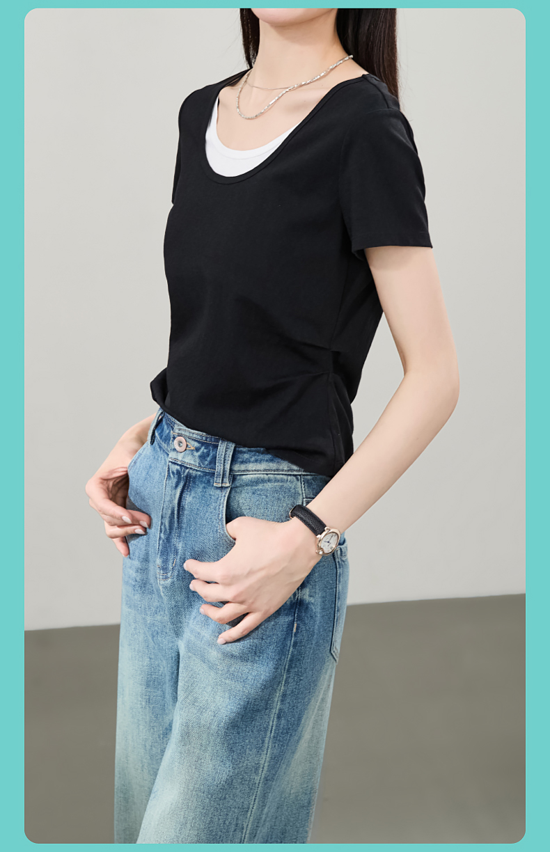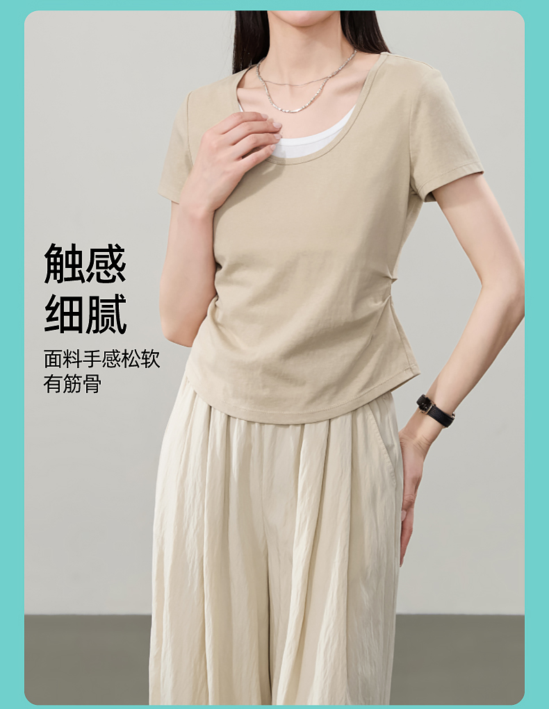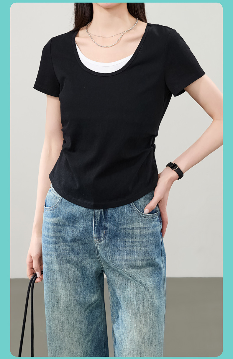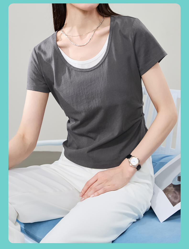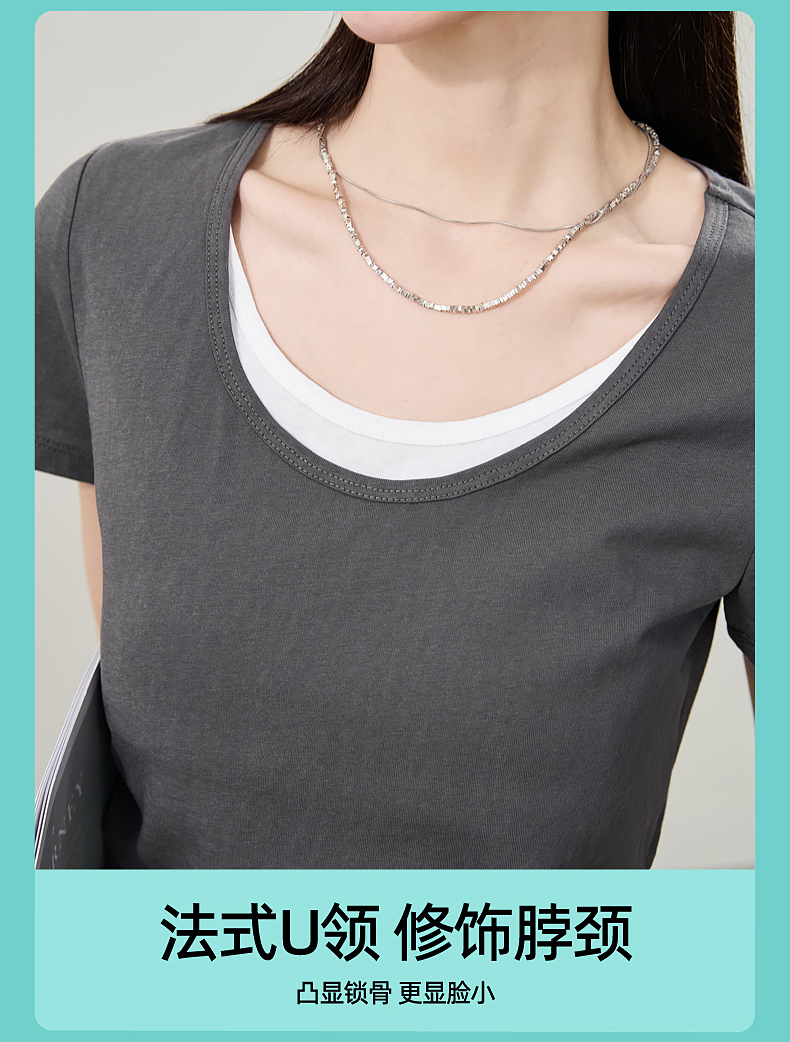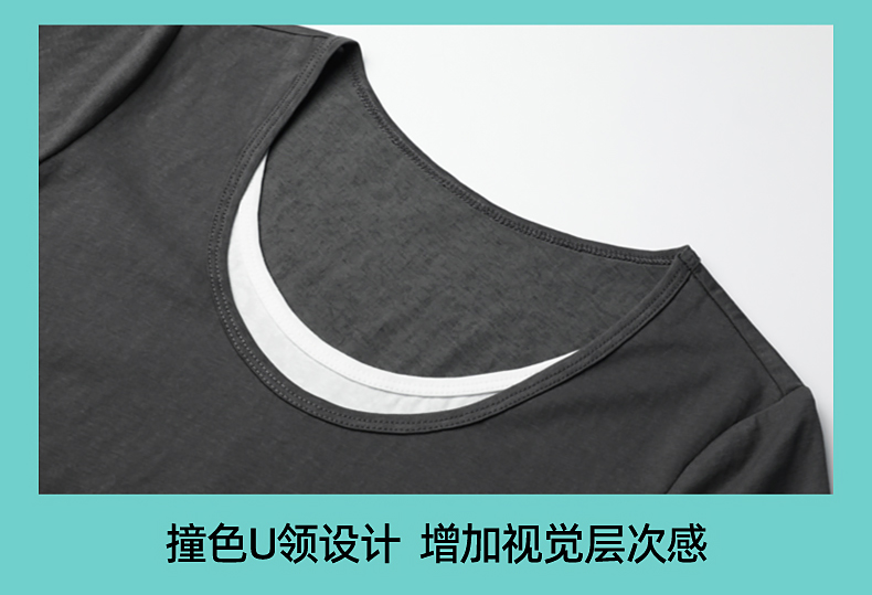【假两件U领短袖T恤】逸阳夏新款正肩撞色修身显瘦打底衫5158