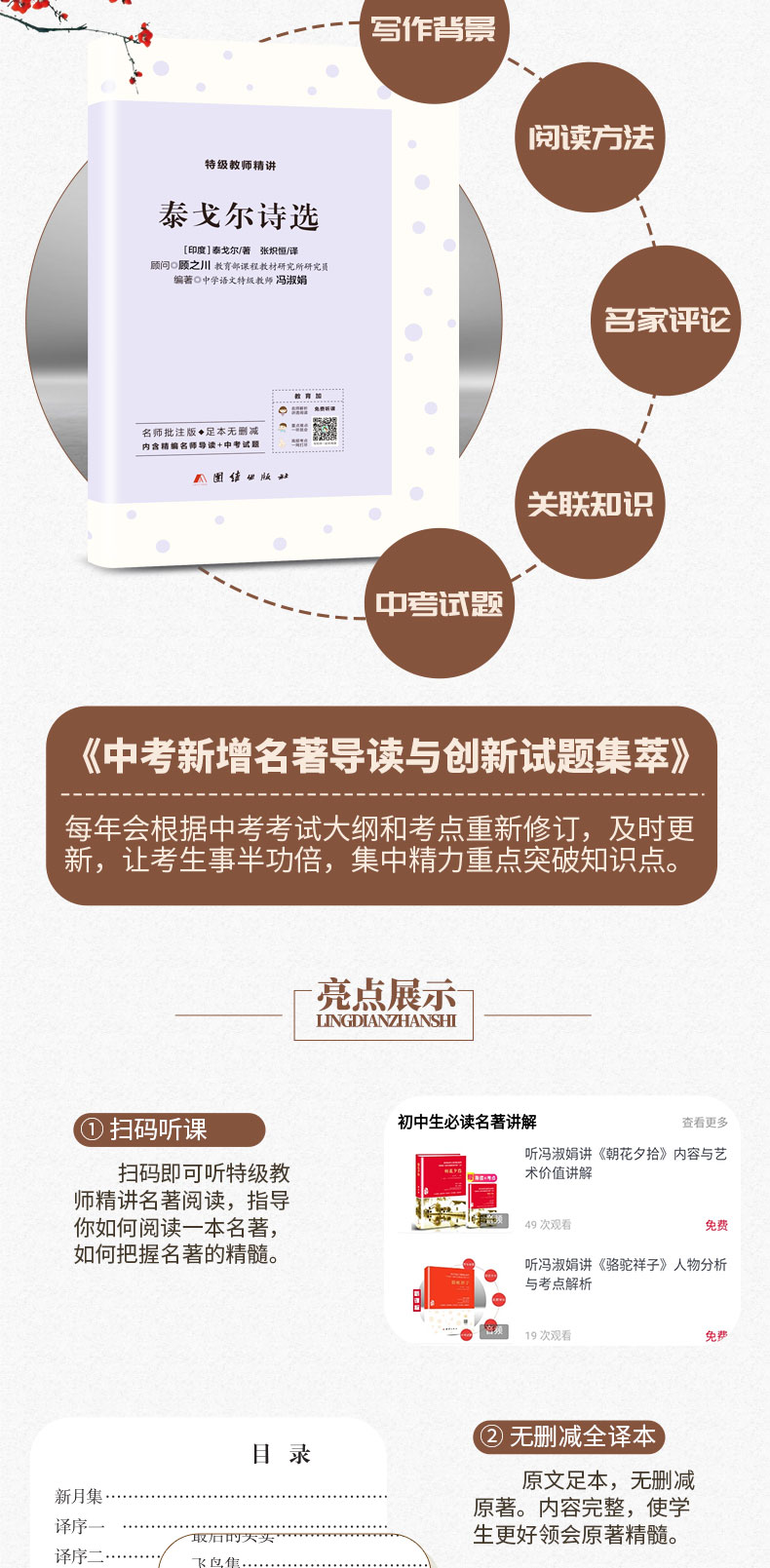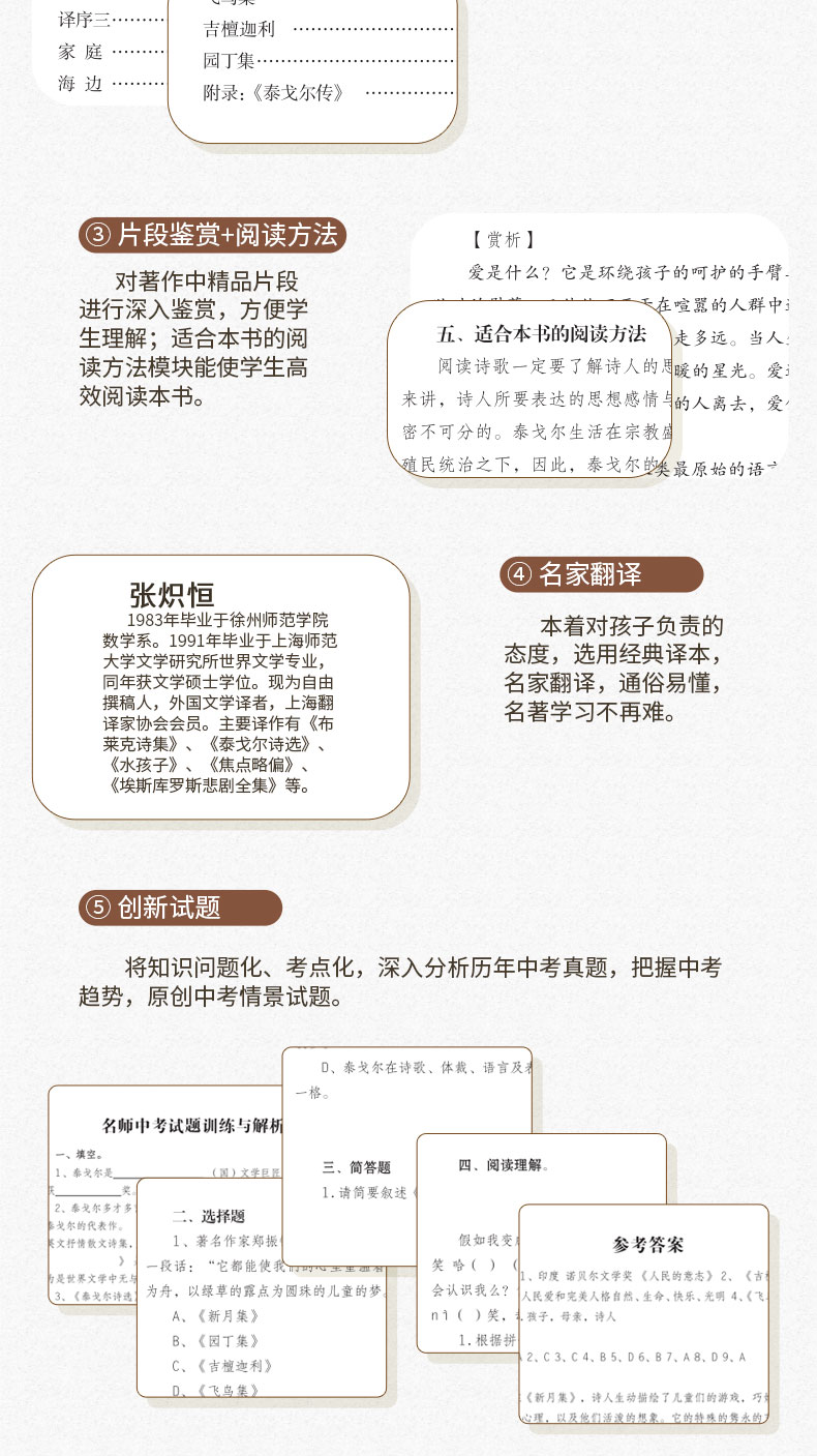 《泰戈尔诗选》包括泰戈尔的具代表性的作品《新月集》《飞鸟集》。泰戈尔的诗或小巧玲珑,或灿烂辉宏,给世人以智慧与启迪。这些诗歌描写小草、流萤、落叶、飞鸟、山水、河流……简短的诗句清新、亮丽,其中的韵味却很厚实,耐人寻味。