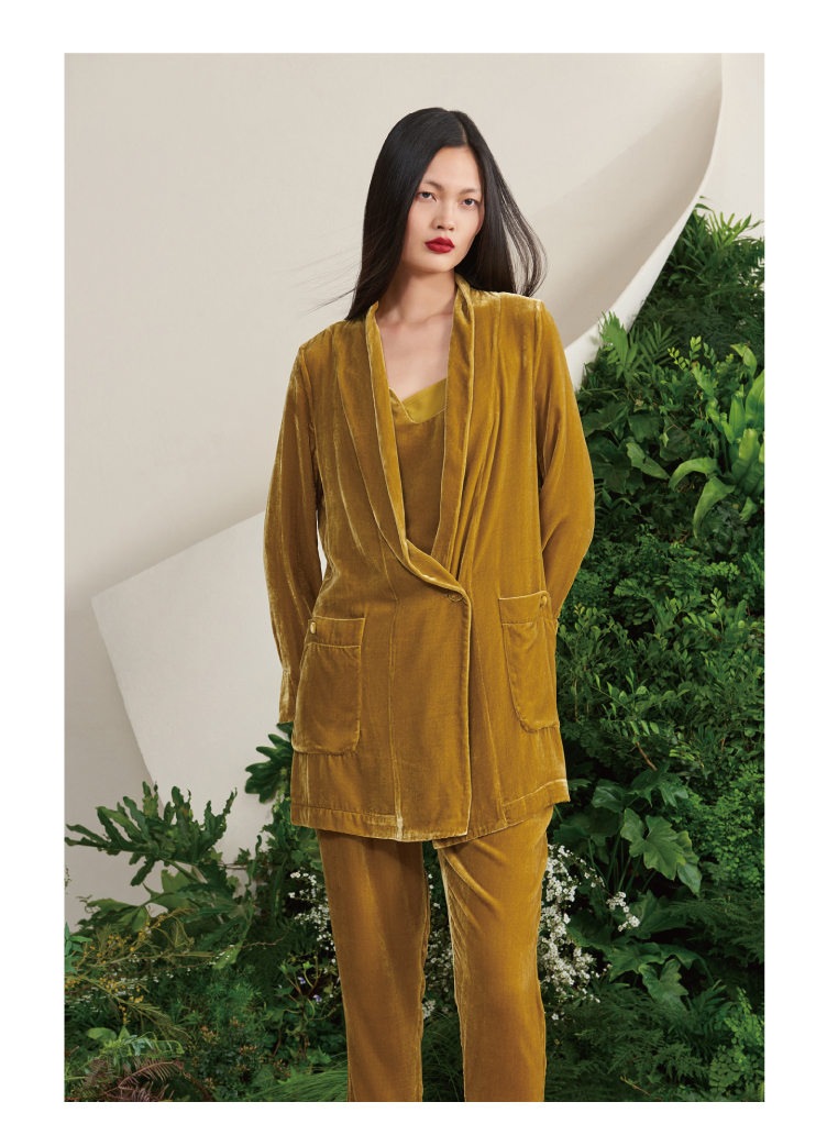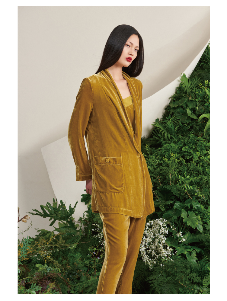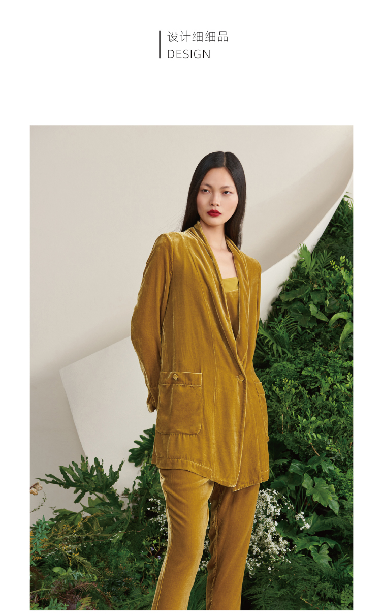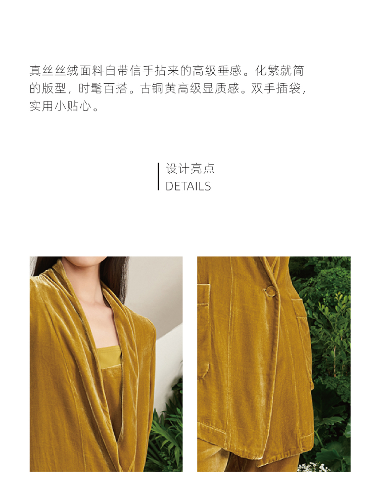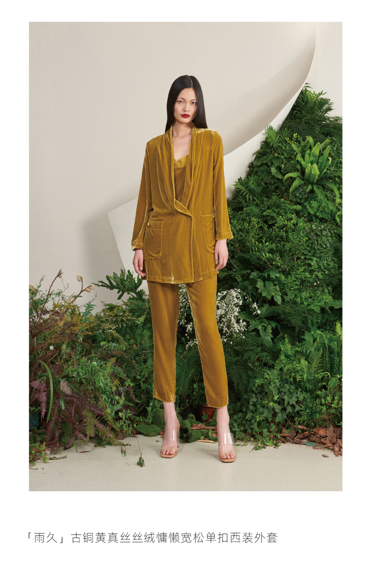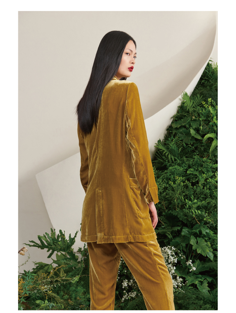【雨久】古铜黄真丝丝绒慵懒宽松单扣西装外套/00187A