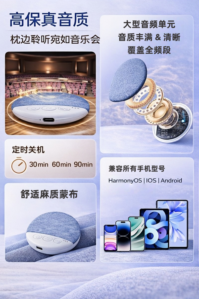 【品名】瑞士AURARO第6代枕边音响沉浸贴耳发声不扰枕边人可放在枕头下扁平设计无异物感 【规格】蓝色1个 【产地】国内 【发货包装】独立包装 【发货地】广东 【发货快递】中通、圆通、韵达随机发 【不发货区域】新疆、西藏、港澳台 【发货时效】48-72小时,周末节假日顺延 |