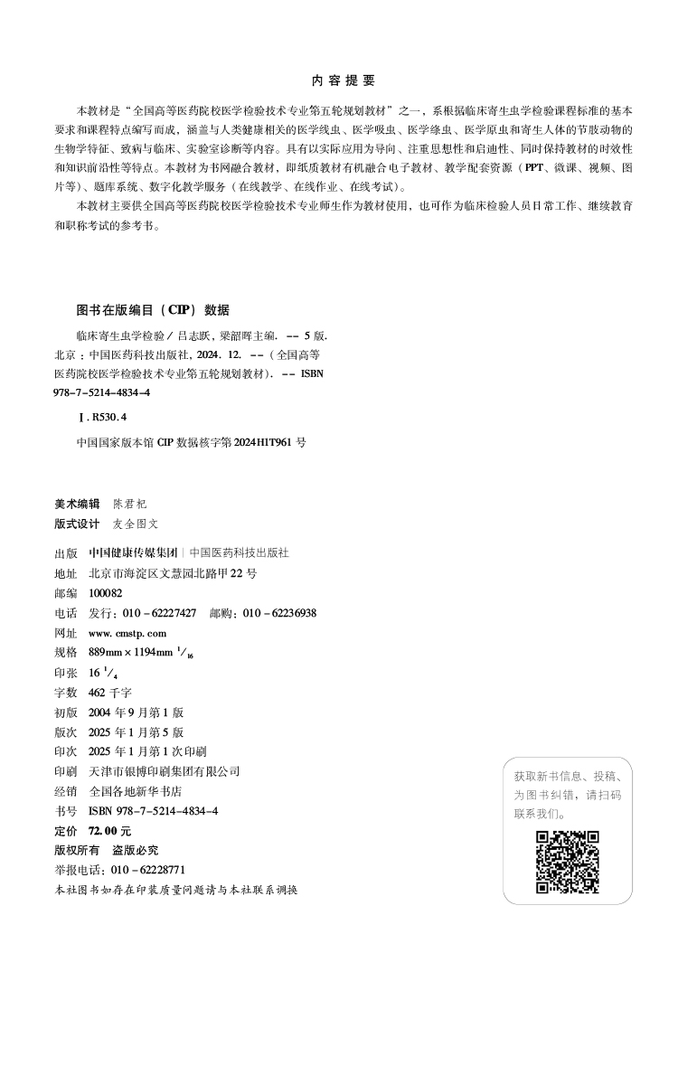 临床寄生虫学检验 第5版 全国高等医药院校医学检验技术专业第五轮规划教材 吕志跃等编 供医学检验技术专业用 中国医药科技出版社