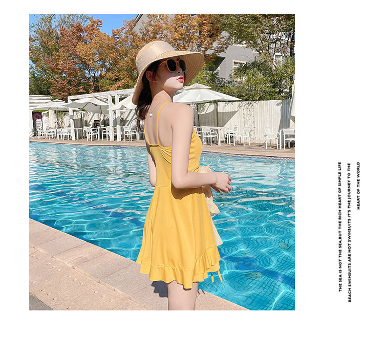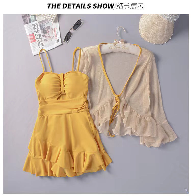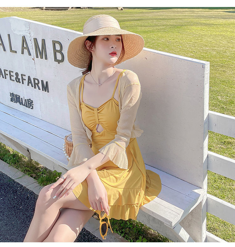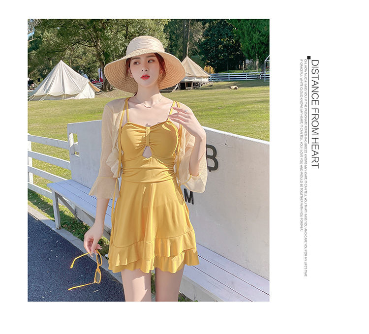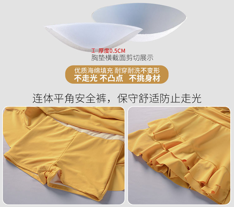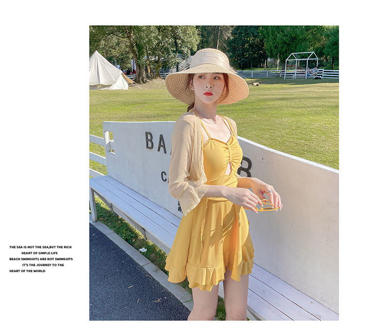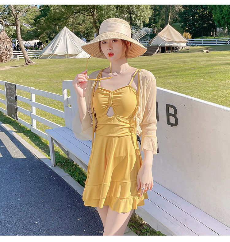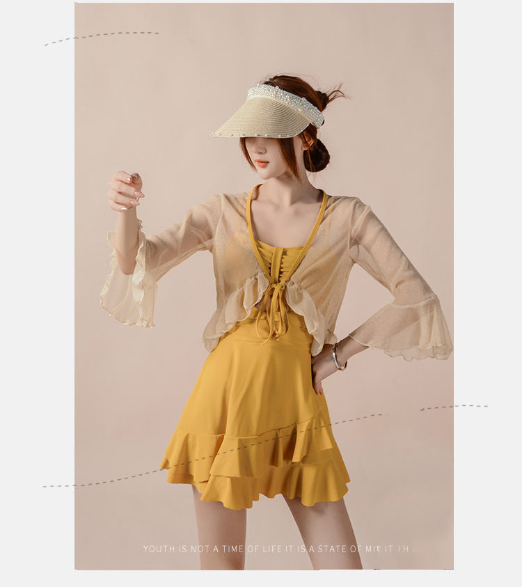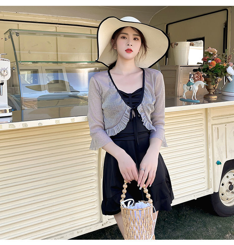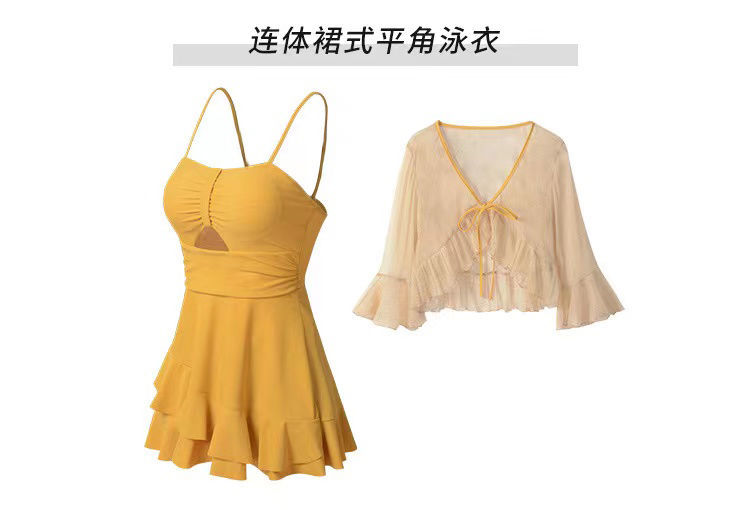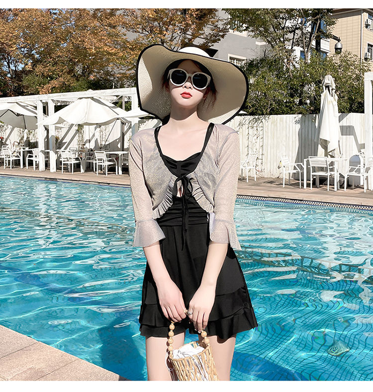泡温泉游泳衣女士连体保守遮肚长袖仙裙式套装rbl24