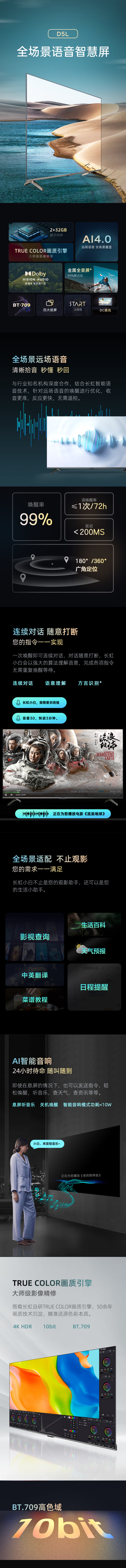 长虹(912630) 65英寸4K超高清 智能网络全面屏 手机投屏 在线观影 光学防蓝光 平板液晶LED电视机65D5L