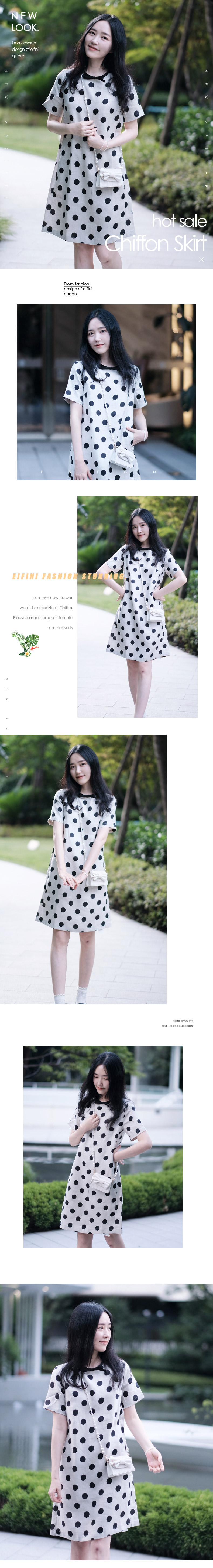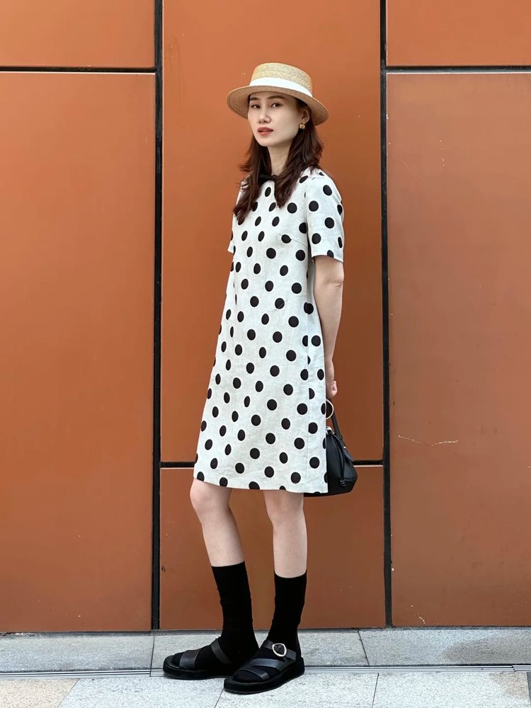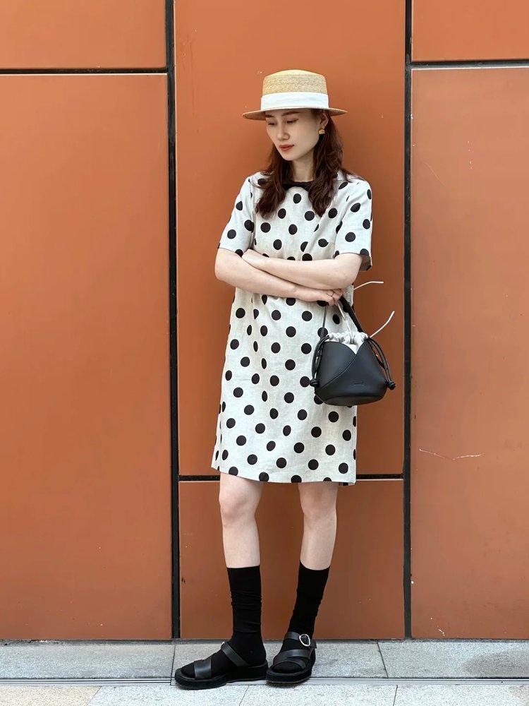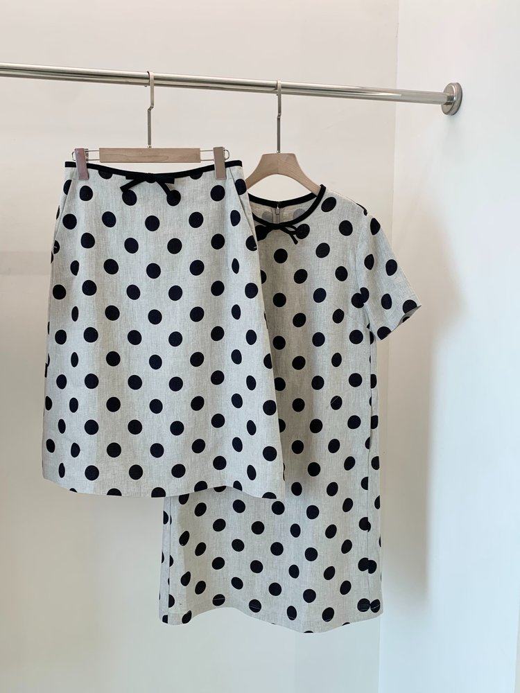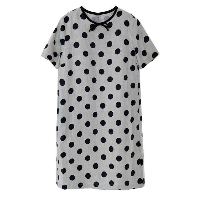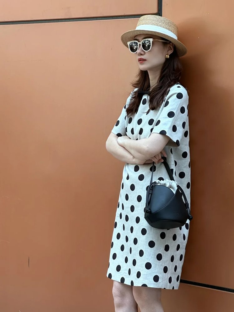 小禾同款新款麻质黑圆点结合,俏皮甜美蝴蝶结点缀