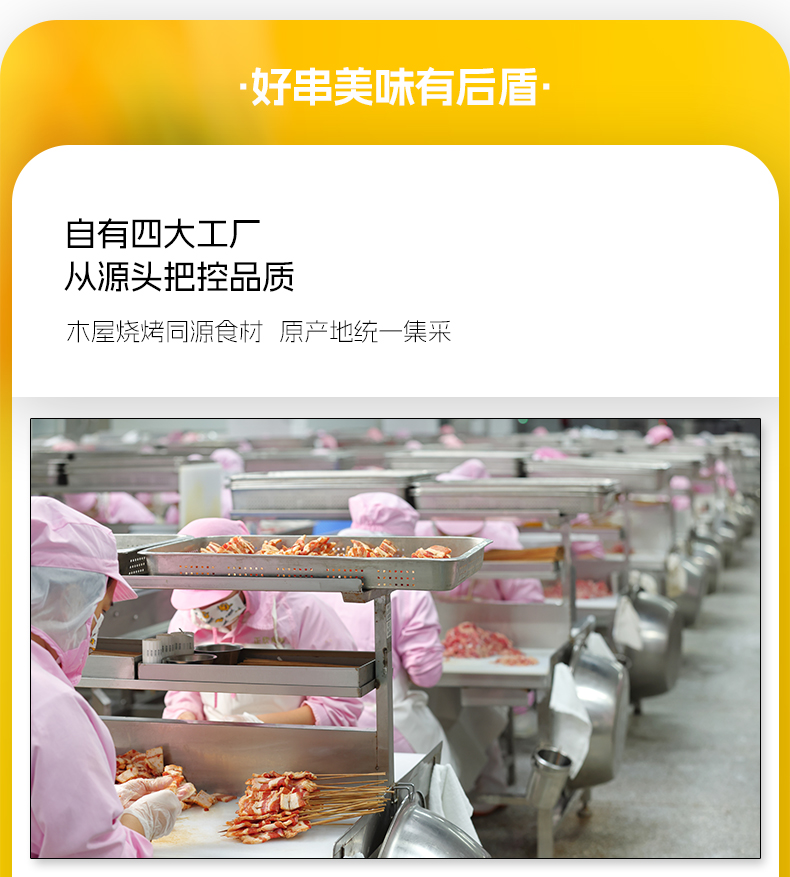 - 木屋烧烤半成品套装,一键下单,使命必达。 -全国300家门店支持次日到店自提 -全国顺丰包邮,当日下单,次日顺丰送货上门(部分区域除外,实际以顺丰时效为准)