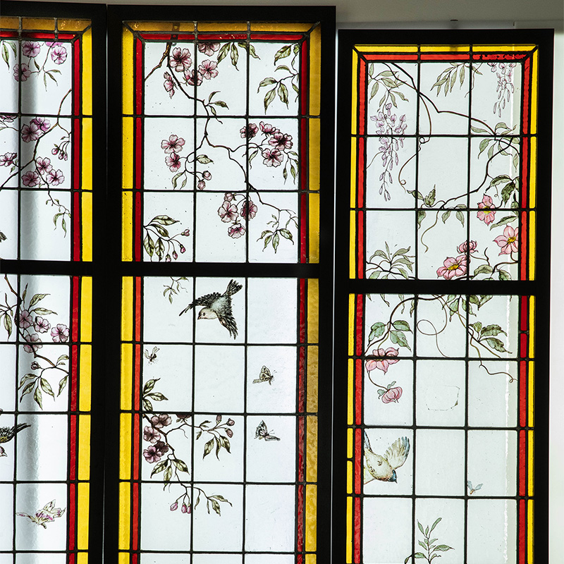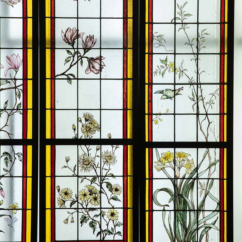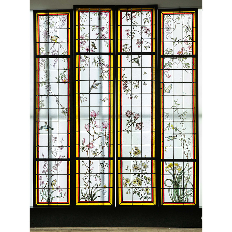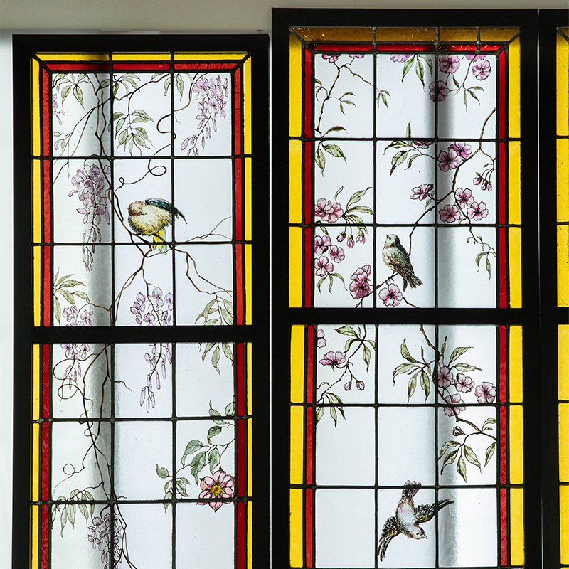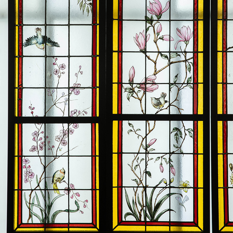19世纪末20世纪初法国新艺术时期出品雀鸟繁花主题彩绘玻璃花窗一组四件