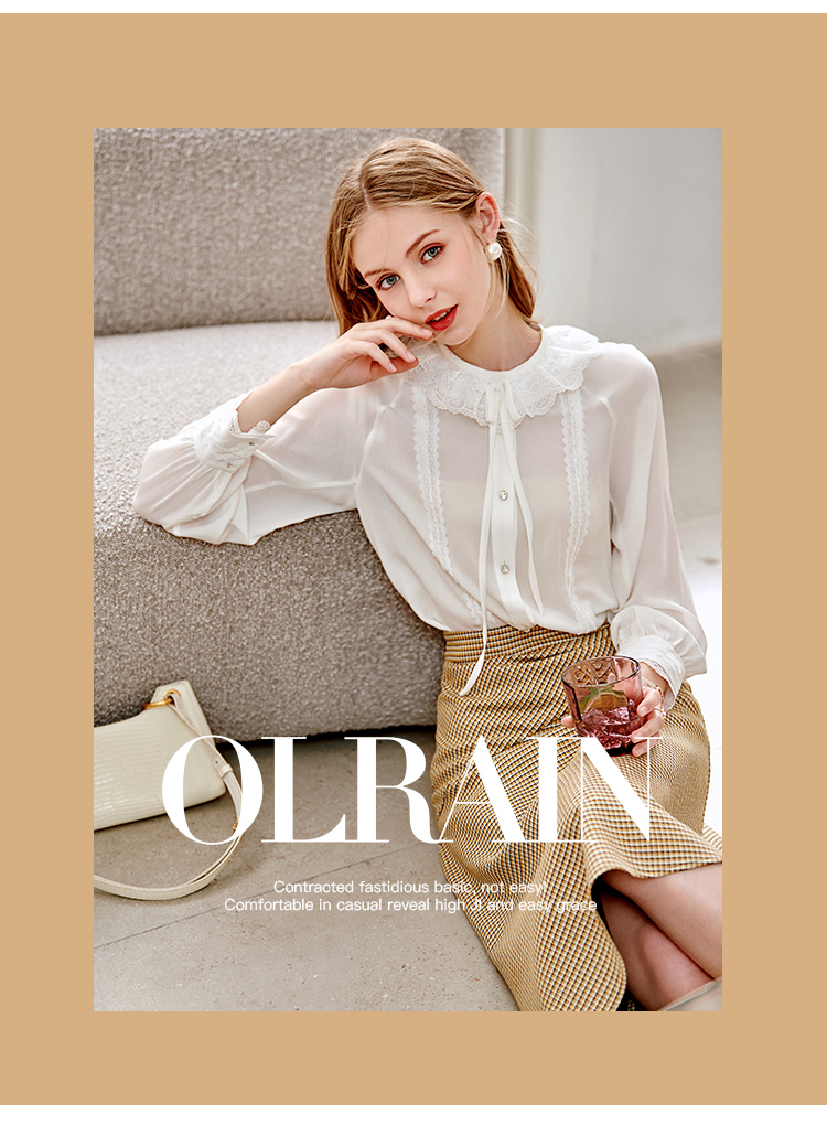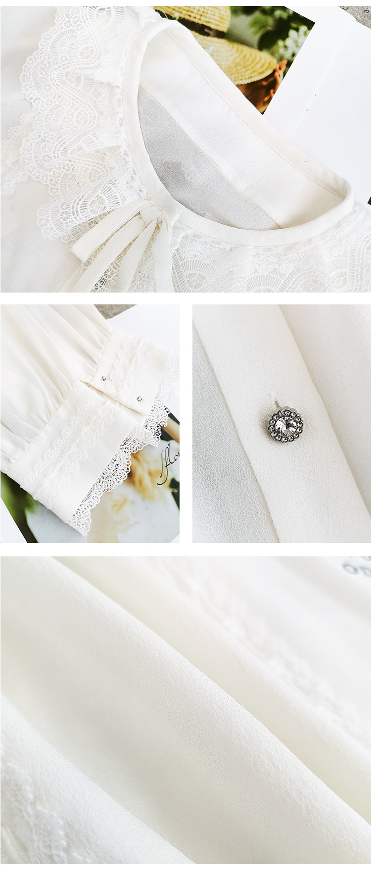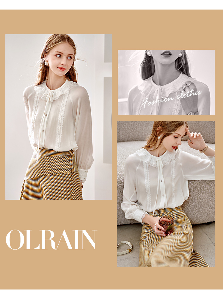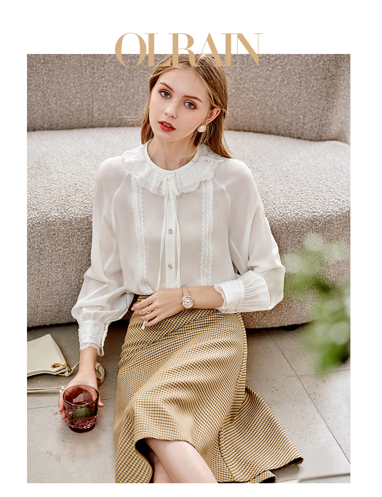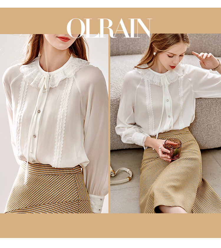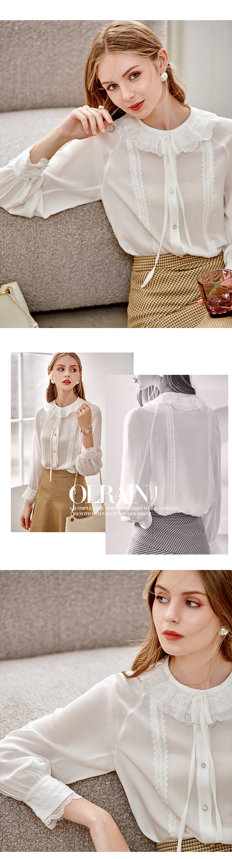 欧芮儿白色雪纺衬衫女春季新款重工蕾丝拼接系带领口简约气质衬衣
