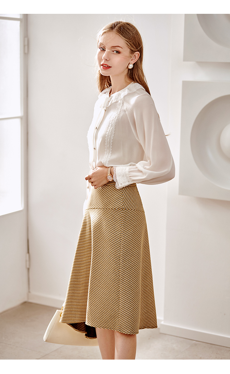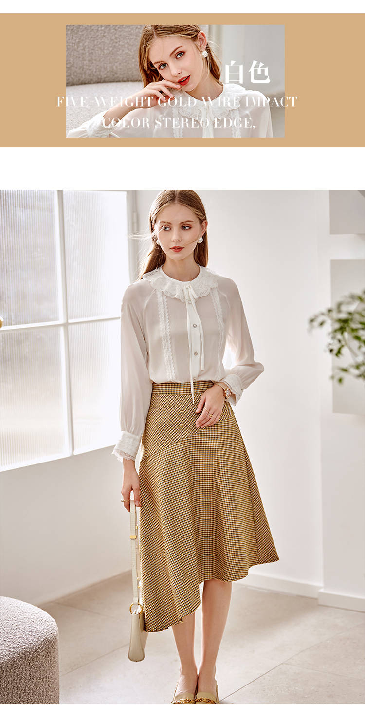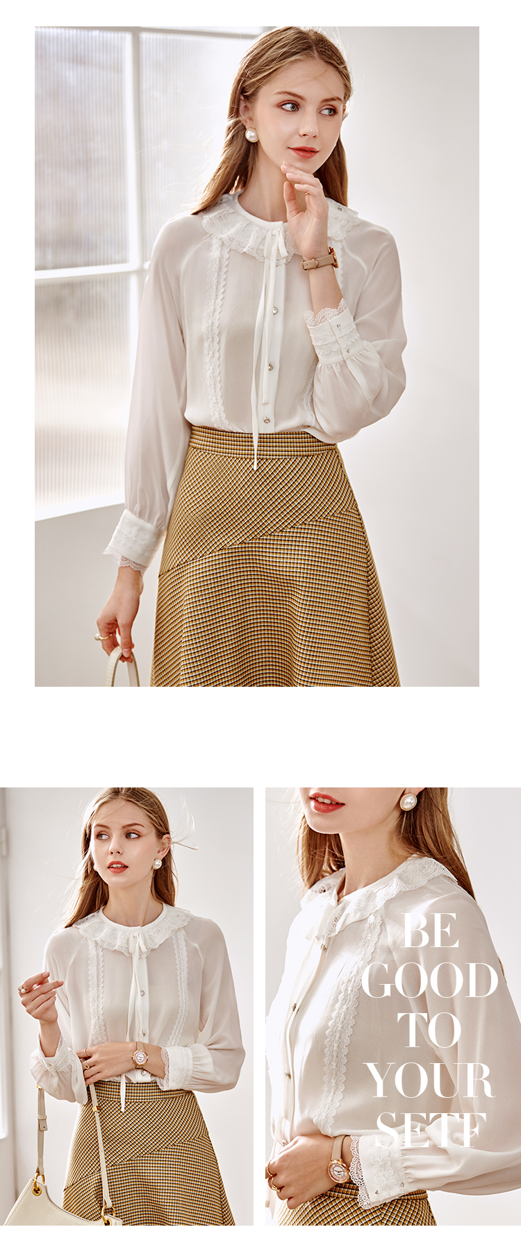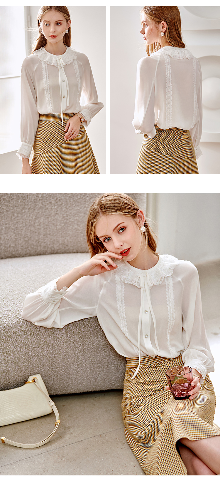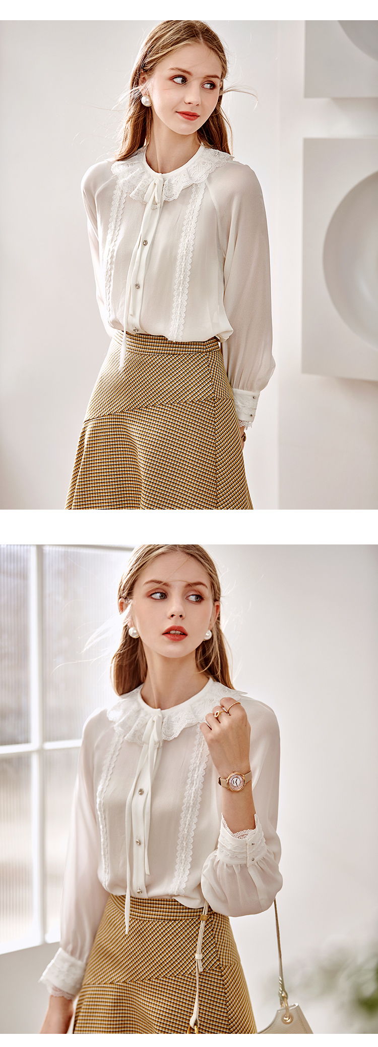 欧芮儿白色雪纺衬衫女春季新款重工蕾丝拼接系带领口简约气质衬衣
