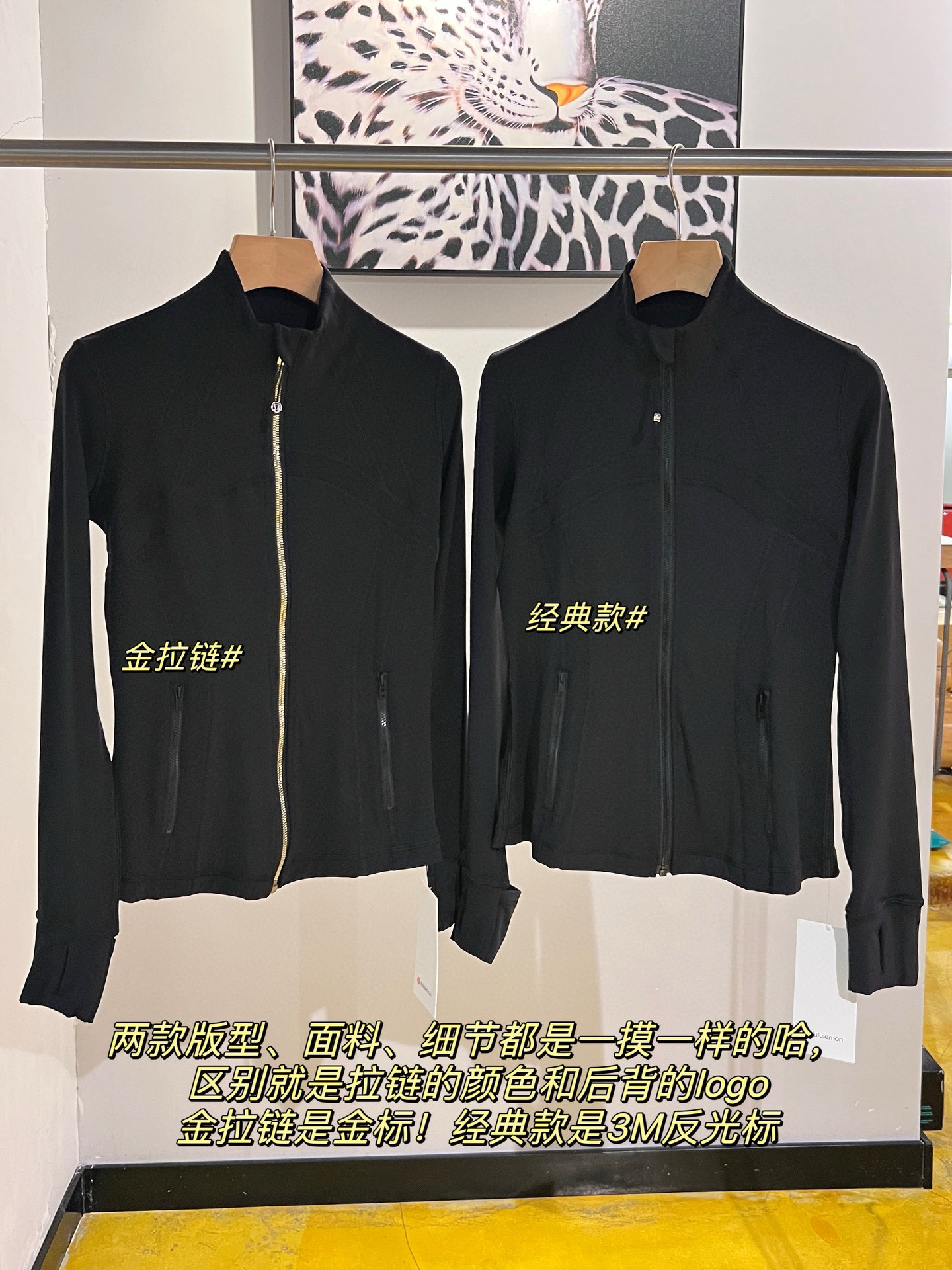两款版型、面料、细节都是一摸一样的哈,区别就是拉链的颜色和后背的logo