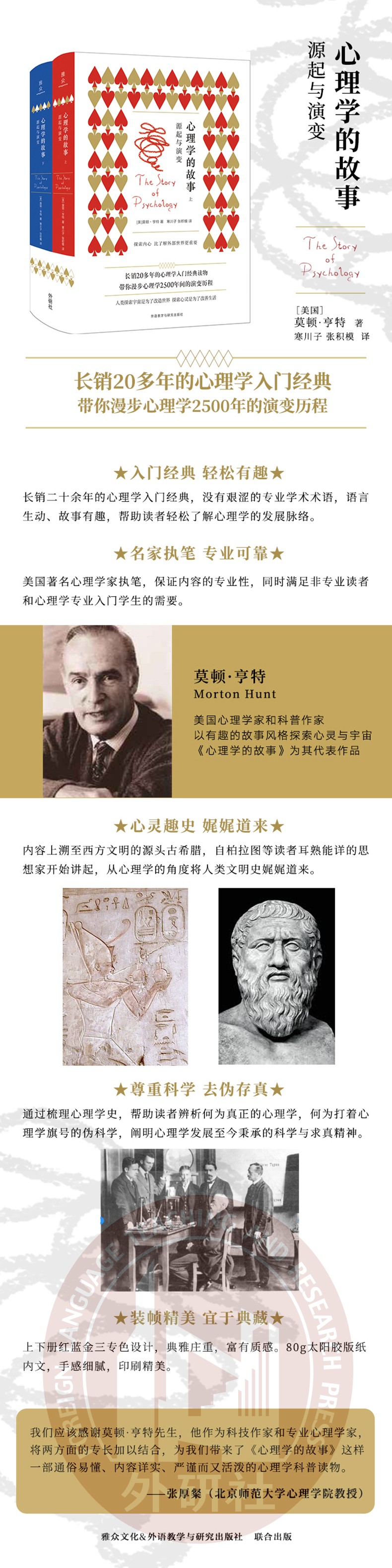 我们应该感谢莫顿·亨特先生,他作为科技作家和专业心理学家,将两方面的专长加以结合,为我们带来了《心理学的故事:源起与演变》这样一部通俗易懂、内容详实、严谨而又活泼的心理学科普读物。