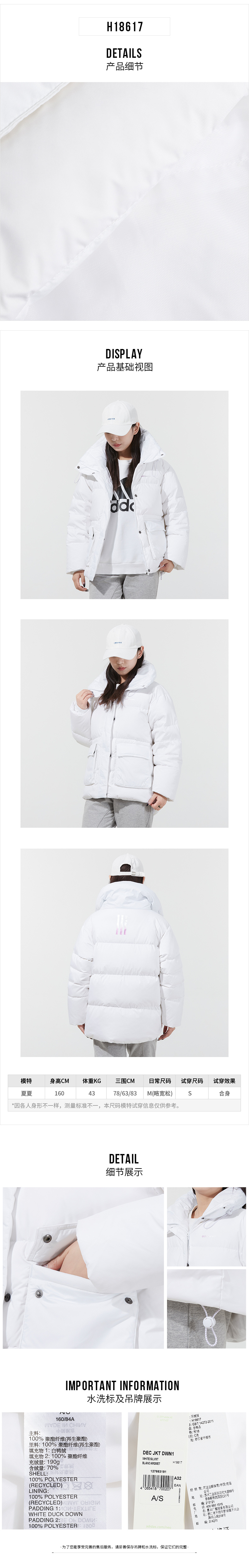 Adidas阿迪达斯NEO女装冬季新款保暖舒适防风羽绒服H18617