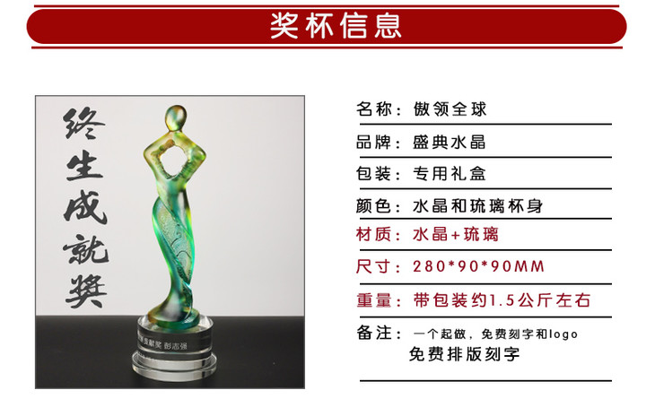 颁奖典礼奖品 商务活动奖杯定制琉璃纪念品刻字年会表彰终生成就